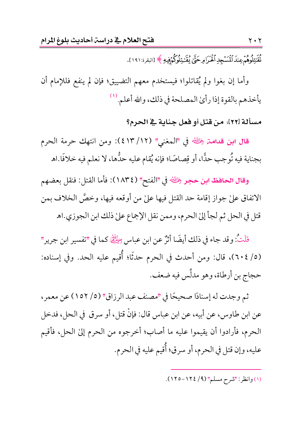 قلتُ: وقد جاء في ذلك أيضًا أثرٌ عن ابن عباس -رضي الله عنهما- كما في «تفسير ابن جرير» (٥/ ٦٠٤)، قال: ومن أحدث في الحرم حدثًا؛ أُقيم عليه الحد. وفي إسناده: حجاج بن أرطاة، وهو مدلِّس فيه ضعف.