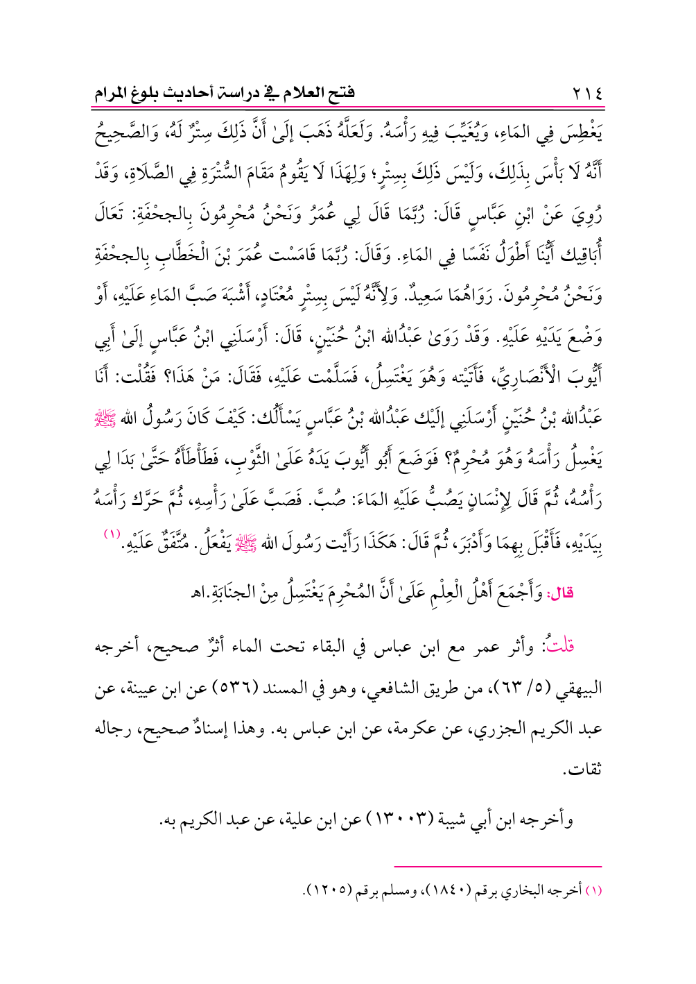 يَغْطِسَ فِي المَاءِ، وَيُغَيِّبَ فِيهِ رَأْسَهُ. وَلَعَلَّهُ ذَهَبَ إلَى أَنَّ ذَلِكَ سِتْرٌ لَهُ، وَالصَّحِيحُ أَنَّهُ لَا بَأْسَ بِذَلِكَ، وَلَيْسَ ذَلِكَ بِسِتْرٍ؛ وَلِهَذَا لَا يَقُومُ مَقَامَ السُّتْرَةِ فِي الصَّلَاةِ، وَقَدْ رُوِيَ عَنْ ابْنِ عَبَّاسٍ قَالَ: رُبَّمَا قَالَ لِي عُمَرُ وَنَحْنُ مُحْرِمُونَ بِالجحْفَةِ: تَعَالَ أُبَاقِيك أَيُّنَا أَطْوَلُ نَفَسًا فِي المَاءِ. وَقَالَ: رُبَّمَا قَامَسْت عُمَرَ بْنَ الْخَطَّابِ بِالجحْفَةِ وَنَحْنُ مُحْرِمُونَ. رَوَاهُمَا سَعِيدٌ. وَلِأَنَّهُ لَيْسَ بِسِتْرٍ مُعْتَادٍ، أَشْبَهَ صَبَّ المَاءِ عَلَيْهِ، أَوْ وَضْعَ يَدَيْهِ عَلَيْهِ. وَقَدْ رَوَى عَبْدُالله ابْنُ حُنَيْنٍ، قَالَ: أَرْسَلَنِي ابْنُ عَبَّاسٍ إلَى أَبِي أَيُّوبَ الْأَنْصَارِيِّ، فَأَتَيْته وَهُوَ يَغْتَسِلُ، فَسَلَّمْت عَلَيْهِ، فَقَالَ: مَنْ هَذَا؟ فَقُلْت: أَنَا عَبْدُالله بْنُ حُنَيْنٍ أَرْسَلَنِي إلَيْك عَبْدُالله بْنُ عَبَّاسٍ يَسْأَلُك: كَيْفَ كَانَ رَسُولُ الله - صلى الله عليه وسلم - يَغْسِلُ رَأْسَهُ وَهُوَ مُحْرِمٌ؟ فَوَضَعَ أَبُو أَيُّوبَ يَدَهُ عَلَى الثَّوْبِ، فَطَأْطَأَهُ حَتَّى بَدَا لِي رَأْسُهُ، ثُمَّ قَالَ لِإِنْسَانٍ يَصُبُّ عَلَيْهِ المَاءَ: صُبَّ. فَصَبَّ عَلَى رَأْسِهِ، ثُمَّ حَرَّك رَأْسَهُ بِيَدَيْهِ، فَأَقْبَلَ بِهِمَا وَأَدْبَرَ، ثُمَّ قَالَ: هَكَذَا رَأَيْت رَسُولَ الله - صلى الله عليه وسلم - يَفْعَلُ. مُتَّفَقٌ عَلَيْهِ. (¬١)