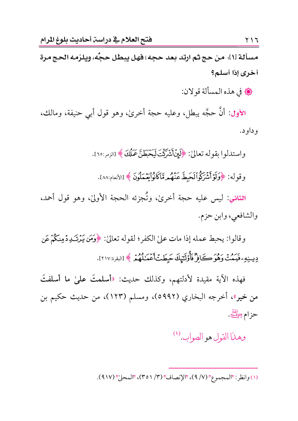 مسألة [١]: من حج ثم ارتد بعد حجه؛ فهل يبطل حجُّه، ويلزمه الحج مرة أخرى إذا أسلم؟
