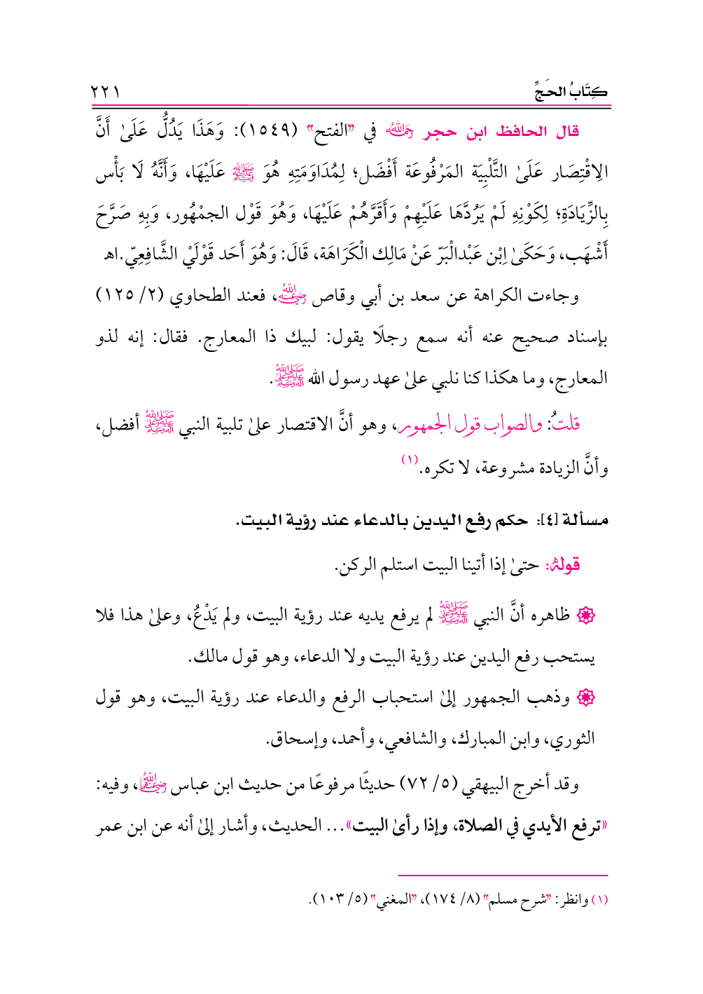 قلتُ: والصواب قول الجمهور، وهو أنَّ الاقتصار على تلبية النبي -صلى الله عليه وعلى آله وسلم- أفضل، وأنَّ الزيادة مشروعة، لا تكره. (¬١)