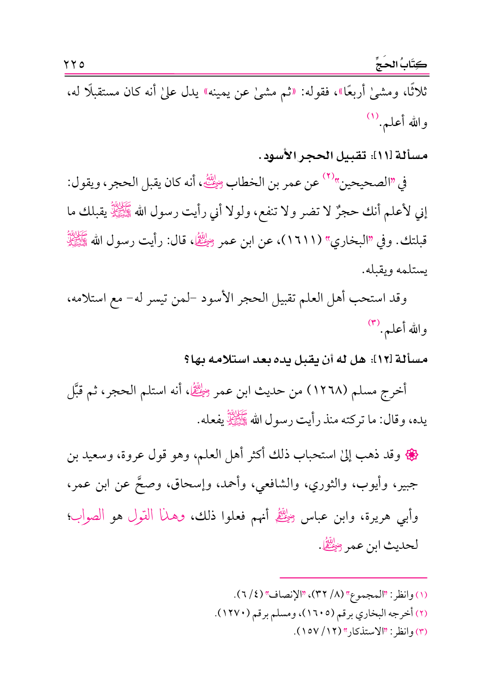 في «الصحيحين» (¬٢) عن عمر بن الخطاب -رضي الله عنه-، أنه كان يقبل الحجر، ويقول: إني لأعلم أنك حجرٌ لا تضر ولا تنفع، ولولا أني رأيت رسول الله -صلى الله عليه وعلى آله وسلم- يقبلك ما قبلتك. وفي «البخاري» (١٦١١)، عن ابن عمر -رضي الله عنهما-، قال: رأيت رسول الله -صلى الله عليه وعلى آله وسلم- يستلمه ويقبله.