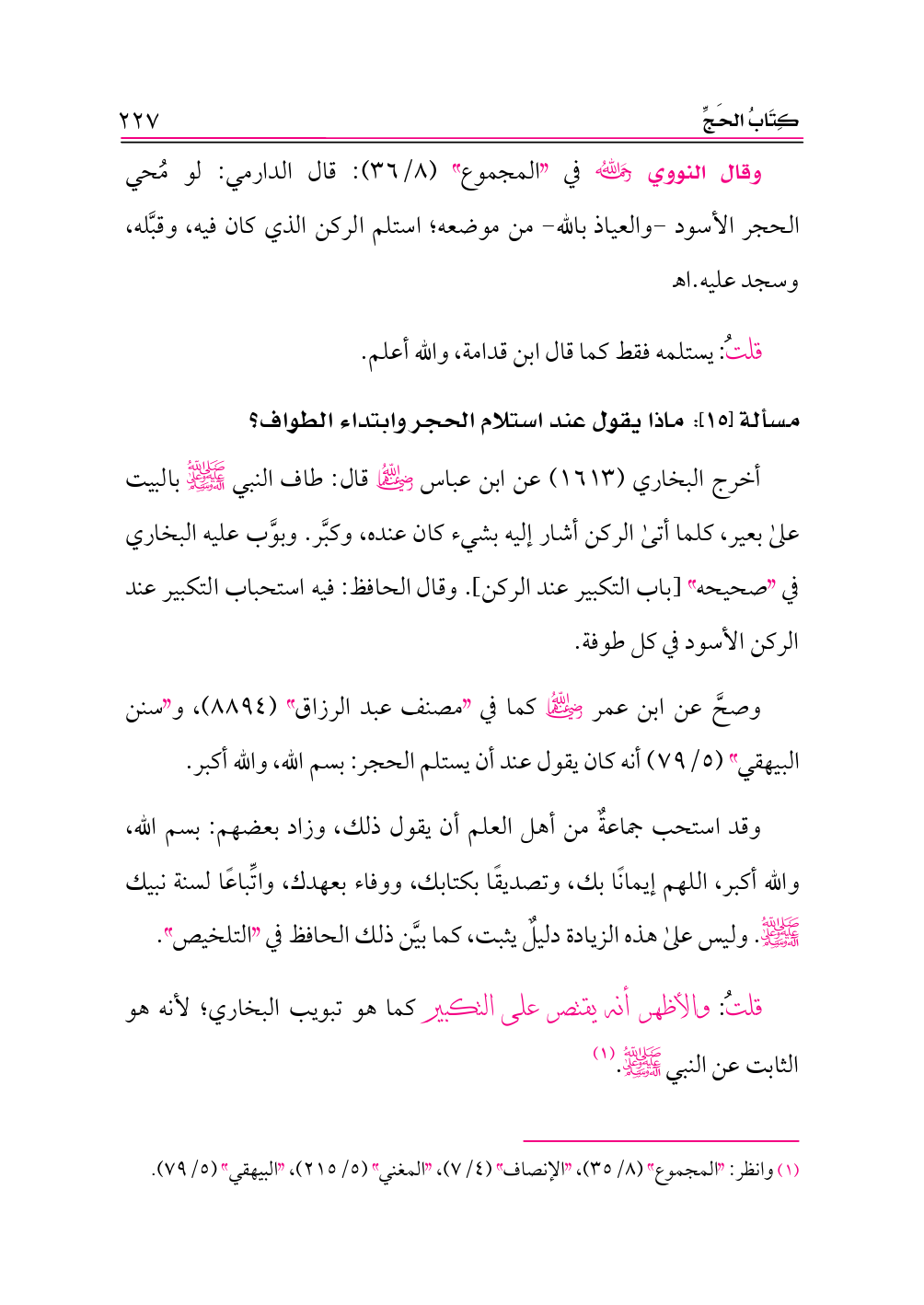 وصحَّ عن ابن عمر -رضي الله عنهما- كما في «مصنف عبد الرزاق» (٨٨٩٤)، و «سنن البيهقي» (٥/ ٧٩) أنه كان يقول عند أن يستلم الحجر: بسم الله، والله أكبر.
