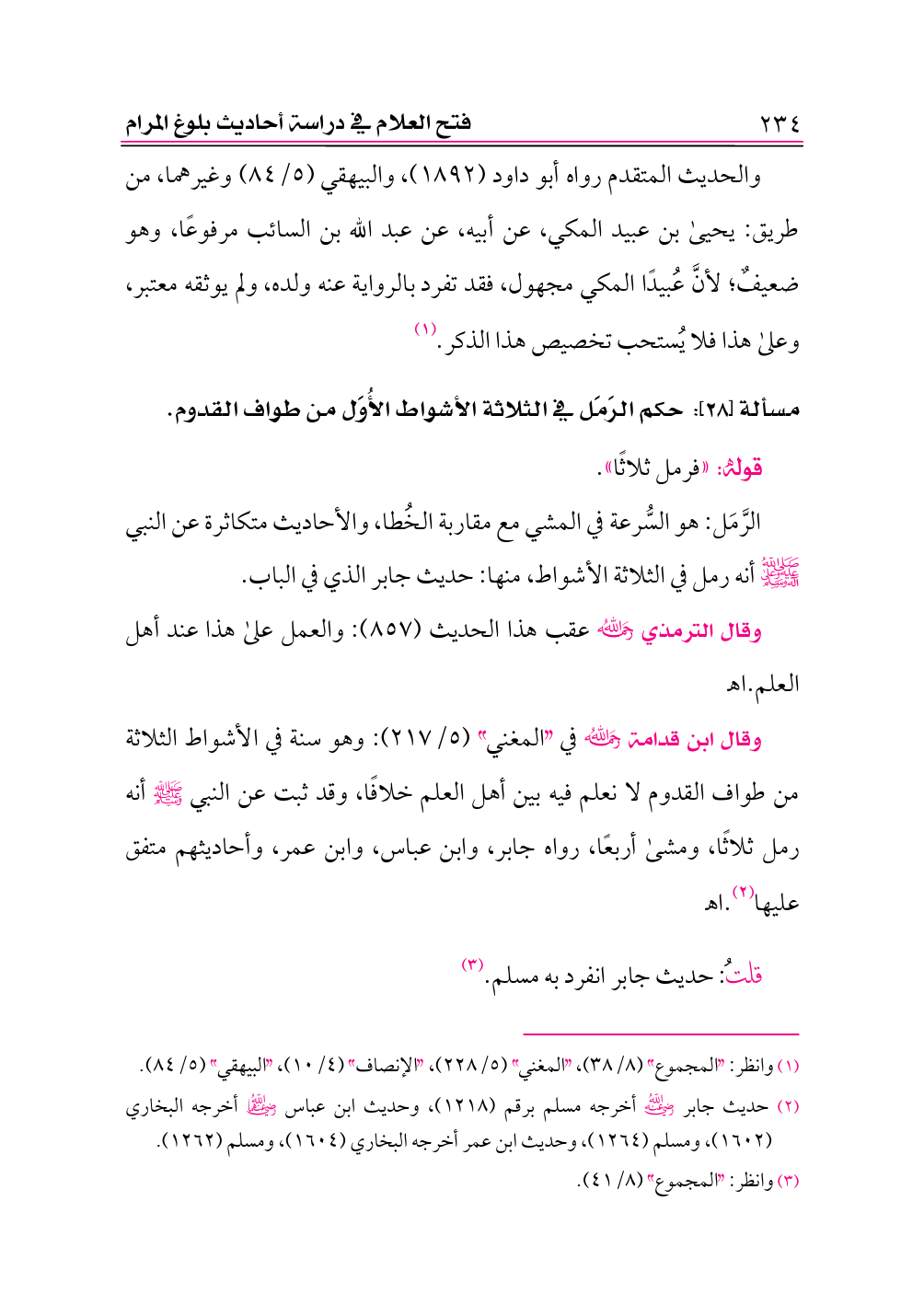 وقال ابن قدامة -رحمه الله- في «المغني» (٥/ ٢١٧): وهو سنة في الأشواط الثلاثة من طواف القدوم لا نعلم فيه بين أهل العلم خلافًا، وقد ثبت عن النبي - صلى الله عليه وسلم - أنه رمل ثلاثًا، ومشى أربعًا، رواه جابر، وابن عباس، وابن عمر، وأحاديثهم متفق عليها (¬٢). اهـ