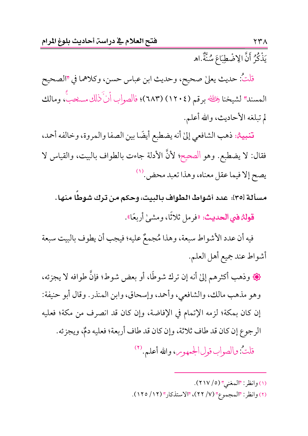 تنبيه: ذهب الشافعي إلى أنه يضطبع أيضًا بين الصفا والمروة، وخالفه أحمد، فقال: لا يضطبع. وهو الصحيح؛ لأنَّ الأدلة جاءت بالطواف بالبيت، والقياس لا يصح إلا فيما عقل معناه، وهذا تعبد محض. (¬١)