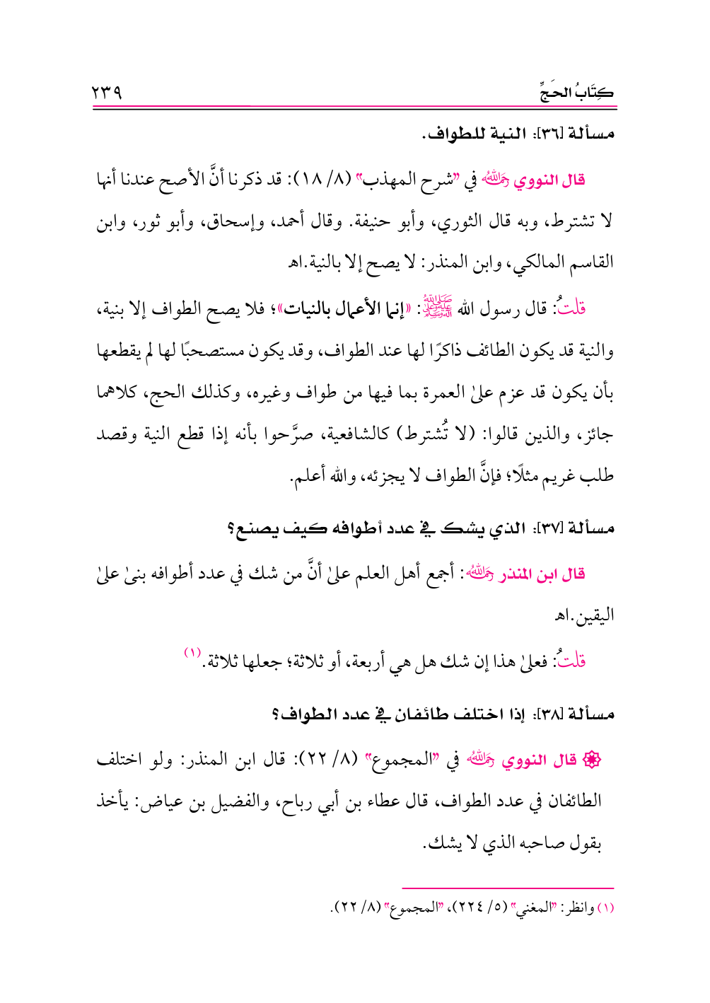 قلتُ: قال رسول الله -صلى الله عليه وعلى آله وسلم-: «إنما الأعمال بالنيات»؛ فلا يصح الطواف إلا بنية، والنية قد يكون الطائف ذاكرًا لها عند الطواف، وقد يكون مستصحبًا لها لم يقطعها بأن يكون قد عزم على العمرة بما فيها من طواف وغيره، وكذلك الحج، كلاهما جائز، والذين قالوا: (لا تُشترط) كالشافعية، صرَّحوا بأنه إذا قطع النية وقصد طلب غريم مثلًا؛ فإنَّ الطواف لا يجزئه، والله أعلم.