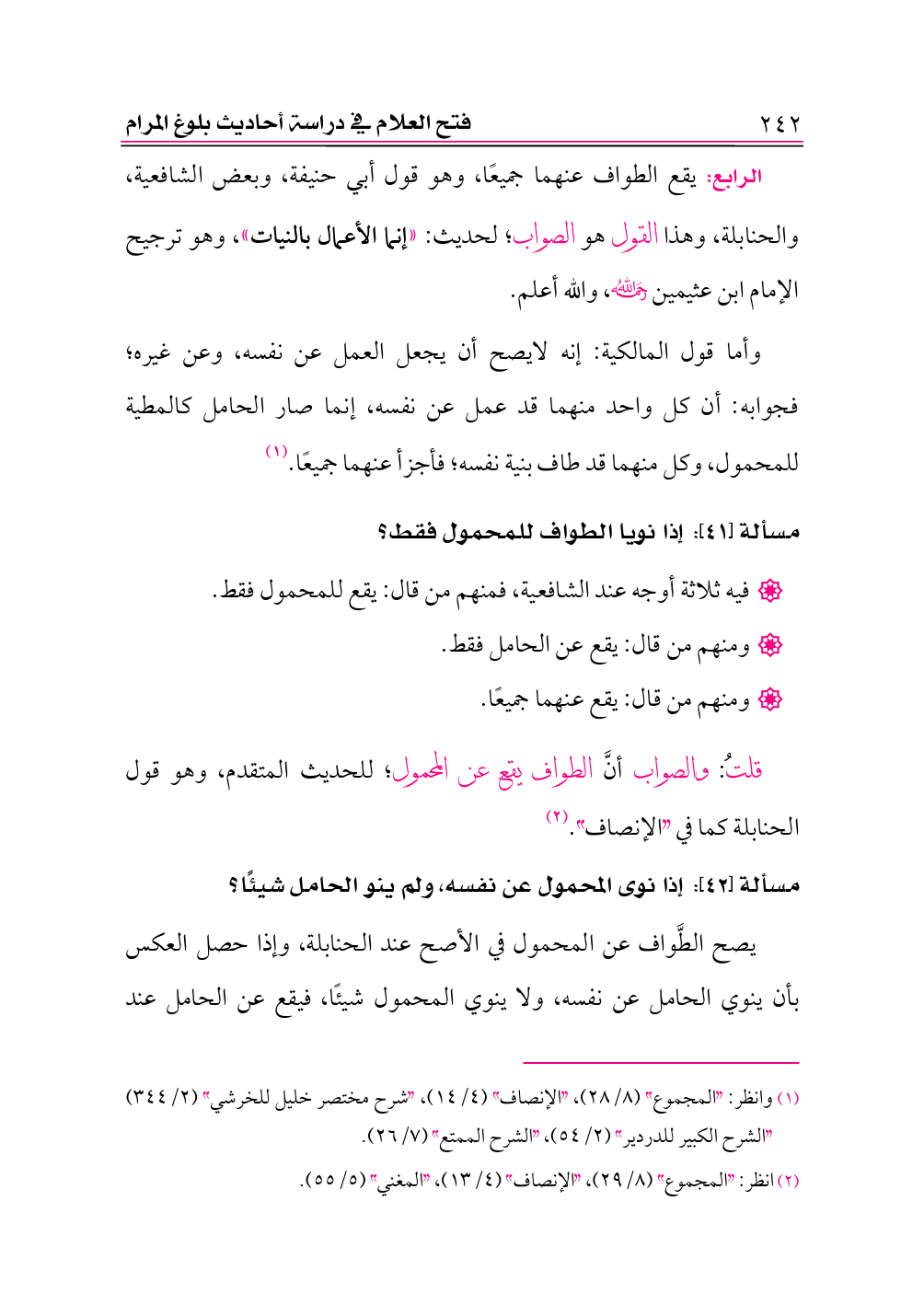 قلتُ: والصواب أنَّ الطواف يقع عن المحمول؛ للحديث المتقدم، وهو قول الحنابلة كما في «الإنصاف». (¬٢)