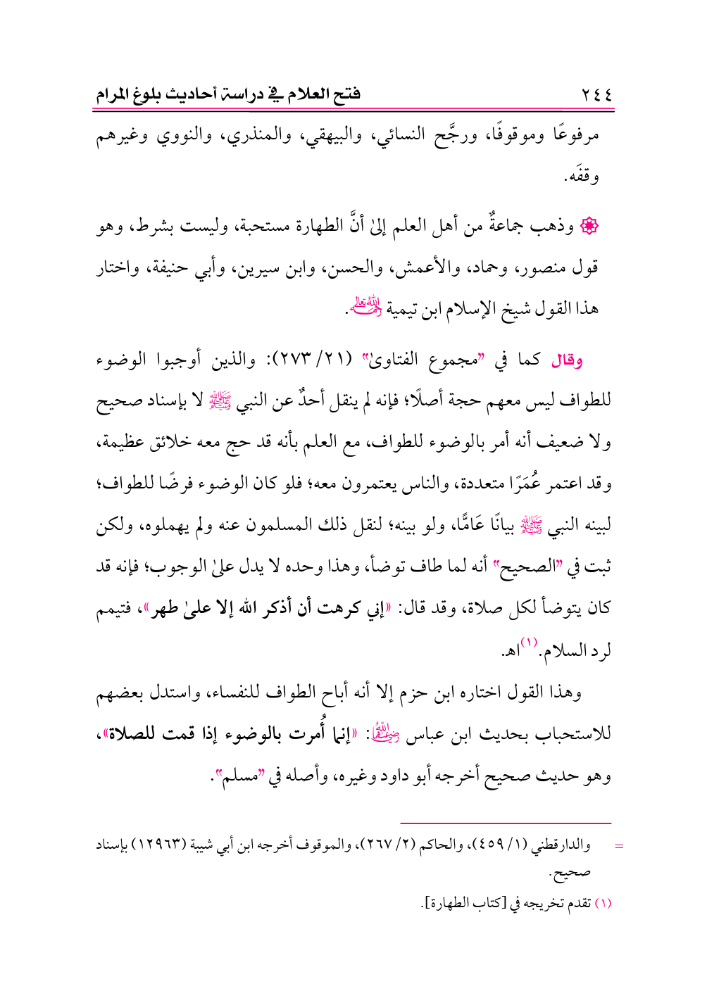 وقال كما في «مجموع الفتاوى» (٢١/ ٢٧٣): والذين أوجبوا الوضوء للطواف ليس معهم حجة أصلًا؛ فإنه لم ينقل أحدٌ عن النبي - صلى الله عليه وسلم - لا بإسناد صحيح ولا ضعيف أنه أمر بالوضوء للطواف، مع العلم بأنه قد حج معه خلائق عظيمة، وقد اعتمر عُمَرًا متعددة، والناس يعتمرون معه؛ فلو كان الوضوء فرضًا للطواف؛ لبينه النبي - صلى الله عليه وسلم - بيانًا عَامًّا، ولو بينه؛ لنقل ذلك المسلمون عنه ولم يهملوه، ولكن ثبت في «الصحيح» أنه لما طاف توضأ، وهذا وحده لا يدل على الوجوب؛ فإنه قد كان يتوضأ لكل صلاة، وقد قال: «إني كرهت أن أذكر الله إلا على طهر»، فتيمم لرد السلام. (¬١) اهـ.