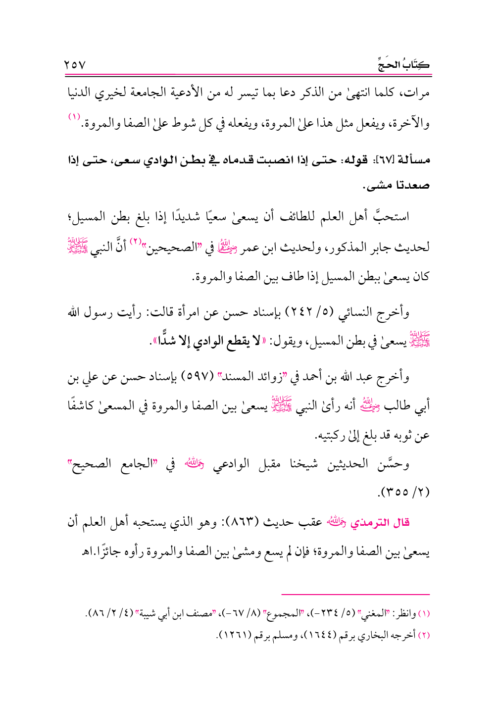 مسألة [٦٧]: قوله: حتى إذا انصبت قدماه في بطن الوادي سعى، حتى إذا صعدتا مشى.