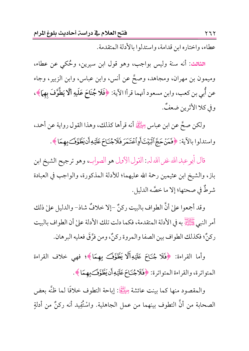 الثالث: أنه سنة وليس بواجب، وهو قول ابن سيرين، وحُكي عن عطاء، وميمون بن مهران، ومجاهد، وصحَّ عن أنس، وابن عباس، وابن الزبير، وجاء عن أُبي بن كعب، وابن مسعود أنهما قرأا الآية: {فَلَا جُنَاحَ عَلَيهِ ألَّا يَطَّوَّفَ بِهِمَا}، وفي كلا الأثرين ضعفٌ.