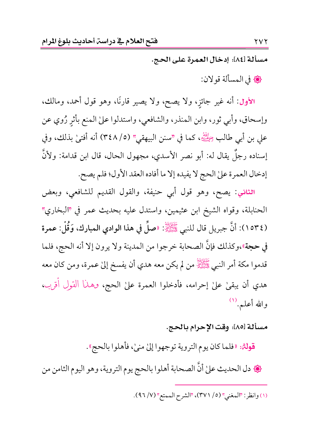 الثاني: يصح، وهو قول أبي حنيفة، والقول القديم للشافعي، وبعض الحنابلة، وقواه الشيخ ابن عثيمين، واستدل عليه بحديث عمر في «البخاري» (١٥٣٤): أنَّ جبريل قال للنبي -صلى الله عليه وعلى آله وسلم-: «صلِّ في هذا الوادي المبارك، وَقُلْ: عمرة في حجة»،وكذلك فإنَّ الصحابة خرجوا من المدينة ولا يرون إلا أنه الحج، فلما قدموا مكة أمر النبي -صلى الله عليه وعلى آله وسلم- من لم يكن معه هدي أن يفسخ إلى عمرة، ومن كان معه هدي أن يبقى على إحرامه، فأدخلوا العمرة على الحج، وهذا القول أقرب، والله أعلم. (¬١)