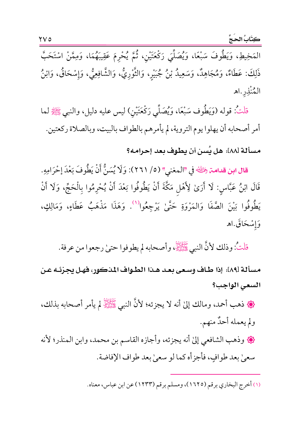 المَخِيطِ، وَيَطُوفَ سَبْعًا، وَيُصَلِّيَ رَكْعَتَيْنِ، ثُمَّ يُحْرِمَ عَقِيبَهُمَا، وَمِمَّنْ اسْتَحَبَّ ذَلِكَ: عَطَاءٌ، وَمُجَاهِدٌ، وَسَعِيدُ بْنُ جُبَيْرٍ، وَالثَّوْرِيُّ، وَالشَّافِعِيُّ، وَإِسْحَاقُ، وَابْنُ المُنْذِرِ. اهـ