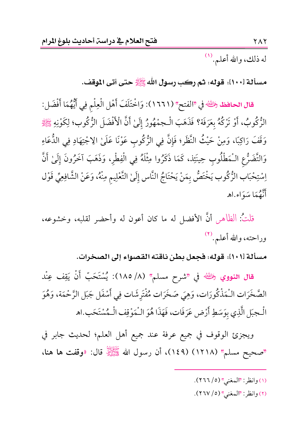 مسألة [١٠٠]: قوله: ثم ركب رسول الله - صلى الله عليه وسلم - حتى أتى الموقف.