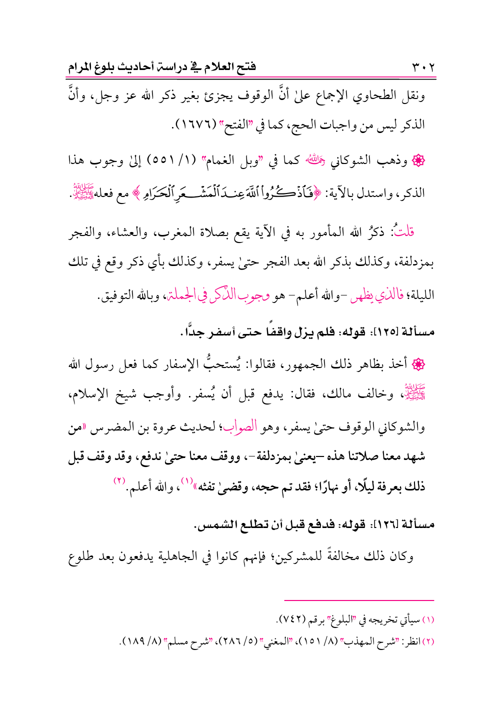 • أخذ بظاهر ذلك الجمهور، فقالوا: يُستحبُّ الإسفار كما فعل رسول الله -صلى الله عليه وعلى آله وسلم-، وخالف مالك، فقال: يدفع قبل أن يُسفر. وأوجب شيخ الإسلام، والشوكاني الوقوف حتى يسفر، وهو الصواب؛ لحديث عروة بن المضرس «من شهد معنا صلاتنا هذه -يعنى بمزدلفة-، ووقف معنا حتى ندفع، وقد وقف قبل ذلك بعرفة ليلًا، أو نهارًا؛ فقد تم حجه، وقضى تفثه» (¬١)، والله أعلم. (¬٢)