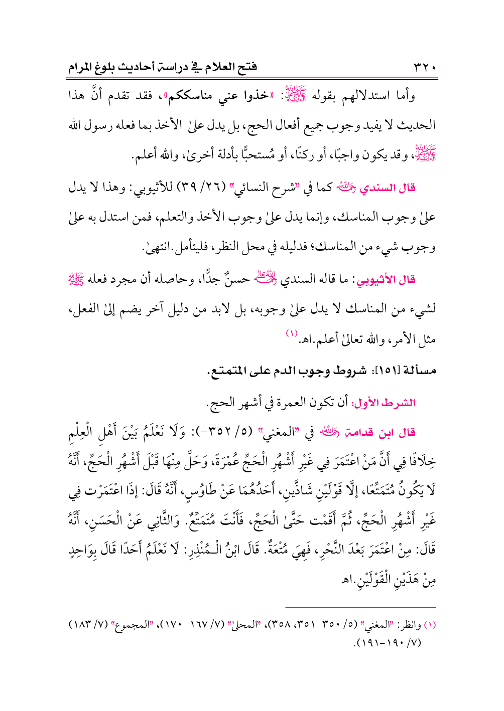 وأما استدلالهم بقوله -صلى الله عليه وعلى آله وسلم-: «خذوا عني مناسككم»، فقد تقدم أنَّ هذا الحديث لا يفيد وجوب جميع أفعال الحج، بل يدل على الأخذ بما فعله رسول الله -صلى الله عليه وعلى آله وسلم-، وقد يكون واجبًا، أو ركنًا، أو مُستحبًّا بأدلة أخرى، والله أعلم.