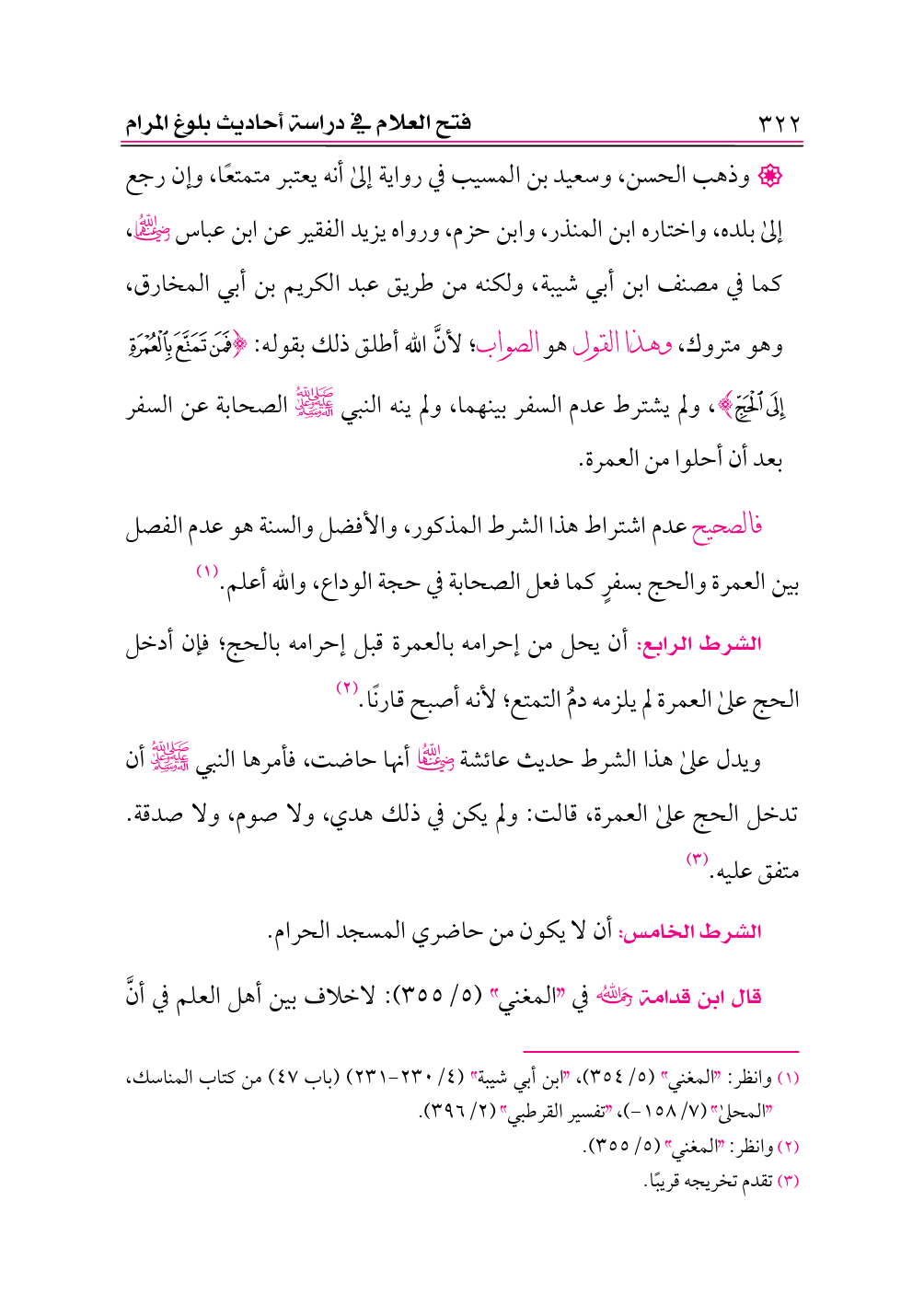 فالصحيح عدم اشتراط هذا الشرط المذكور، والأفضل والسنة هو عدم الفصل بين العمرة والحج بسفرٍ كما فعل الصحابة في حجة الوداع، والله أعلم. (¬١)