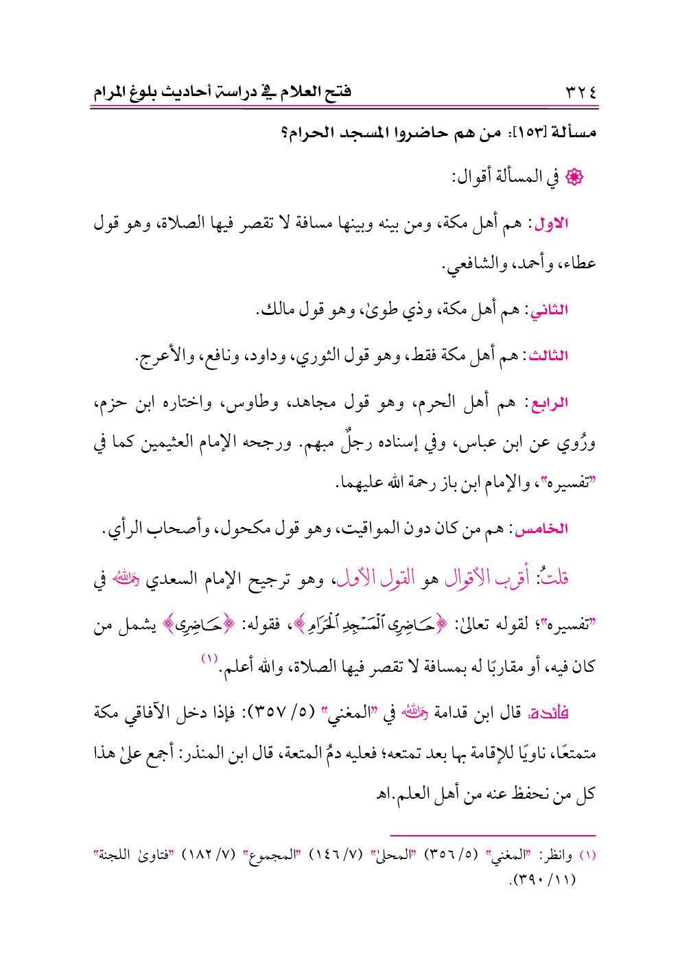 قلتُ: أقرب الأقوال هو القول الأول، وهو ترجيح الإمام السعدي -رحمه الله- في «تفسيره»؛ لقوله تعالى: {حَاضِرِي الْمَسْجِدِ الْحَرَامِ}، فقوله: {حَاضِرِي} يشمل من كان فيه، أو مقاربًا له بمسافة لا تقصر فيها الصلاة، والله أعلم. (¬١)
