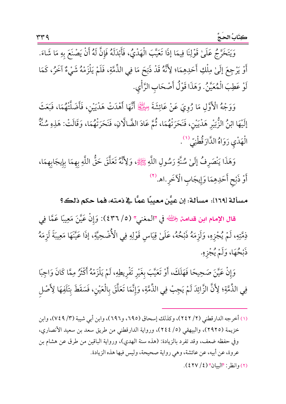 (¬١) أخرجه الدارقطني (٢/ ٢٤٢)، وكذلك إسحاق (٦٩٥، و ٦٩٦)، وابن أبي شيبة (٣/ ٧٤٩)، وابن خزيمة (٢٩٢٥)، والبيهقي (٥/ ٢٤٤)، ورواية الدارقطني من طريق سعد بن سعيد الأنصاري، وفي حفظه ضعف، وقد تفرد بالزيادة: (هذه سنة الهدي)، ورواية الباقين من طرق عن هشام بن عروة، عن أبيه، عن عائشة، وهي رواية صحيحة، وليس فيها هذه الزيادة.