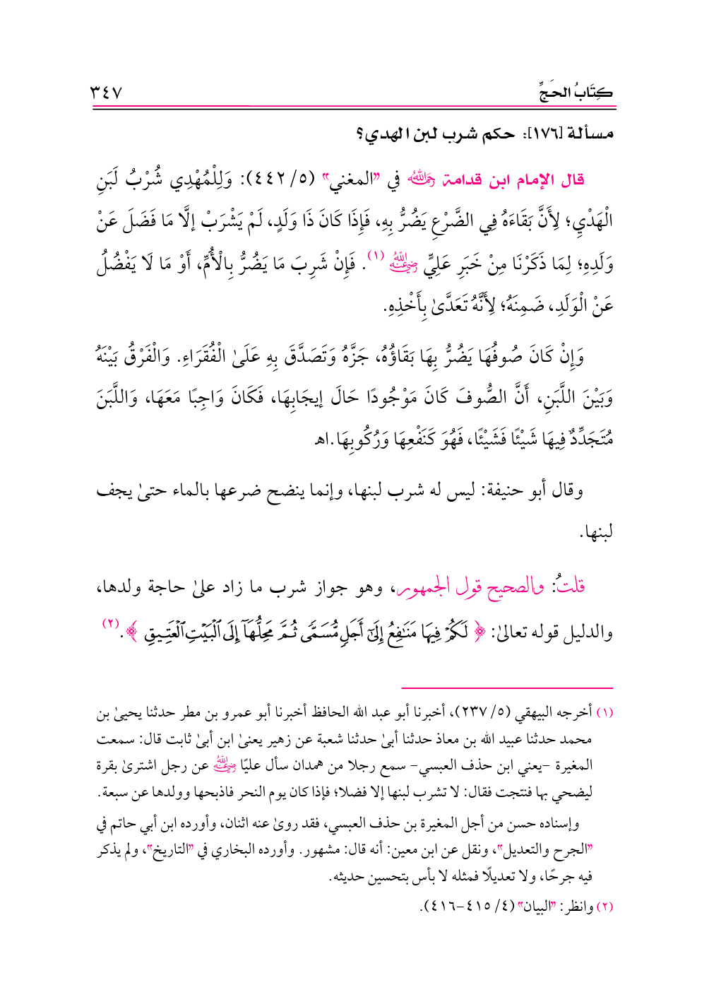(¬١) أخرجه البيهقي (٥/ ٢٣٧)، أخبرنا أبو عبد الله الحافظ أخبرنا أبو عمرو بن مطر حدثنا يحيى بن محمد حدثنا عبيد الله بن معاذ حدثنا أبى حدثنا شعبة عن زهير يعنى ابن أبى ثابت قال: سمعت المغيرة -يعني ابن حذف العبسي- سمع رجلا من همدان سأل عليًا -رضي الله عنه- عن رجل اشترى بقرة ليضحي بها فنتجت فقال: لا تشرب لبنها إلا فضلا؛ فإذا كان يوم النحر فاذبحها وولدها عن سبعة.
