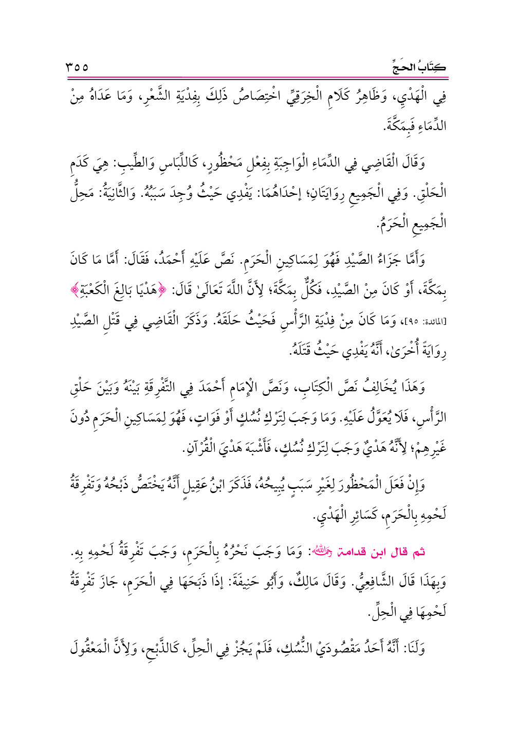 وَهَذَا يُخَالِفُ نَصَّ الْكِتَابِ، وَنَصَّ الْإِمَامِ أَحْمَدَ فِي التَّفْرِقَةِ بَيْنَهُ وَبَيْنَ حَلْقِ الرَّأْسِ، فَلَا يُعَوَّلُ عَلَيْهِ. وَمَا وَجَبَ لِتَرْكِ نُسُكٍ أَوْ فَوَاتٍ، فَهُوَ لِمَسَاكِينِ الْحَرَمِ دُونَ غَيْرِهِمْ؛ لِأَنَّهُ هَدْيٌ وَجَبَ لِتَرْكِ نُسُكٍ، فَأَشْبَهَ هَدْيَ الْقُرْآنِ.