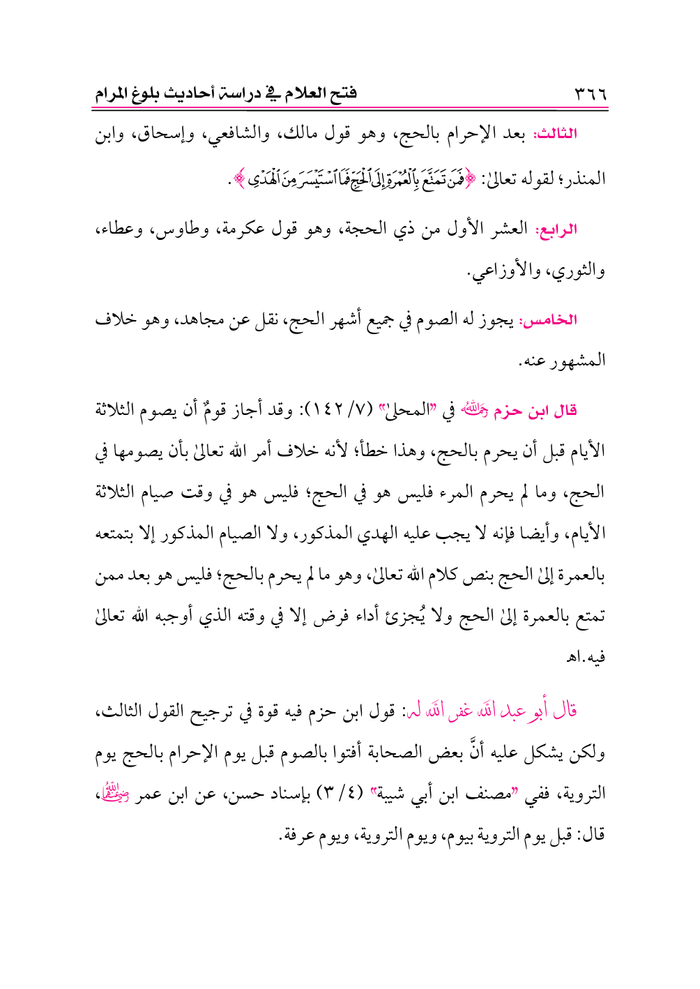قال أبو عبد الله غفر الله له: قول ابن حزم فيه قوة في ترجيح القول الثالث، ولكن يشكل عليه أنَّ بعض الصحابة أفتوا بالصوم قبل يوم الإحرام بالحج يوم التروية، ففي «مصنف ابن أبي شيبة» (٤/ ٣) بإسناد حسن، عن ابن عمر -رضي الله عنهما-، قال: قبل يوم التروية بيوم، ويوم التروية، ويوم عرفة.