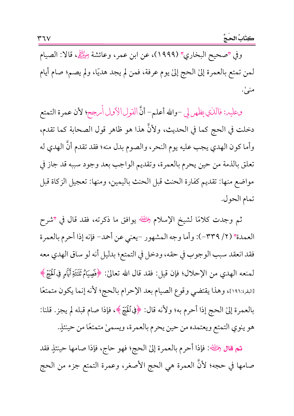 ثم وجدت كلامًا لشيخ الإسلام -رحمه الله- يوافق ما ذكرته، فقد قال في «شرح العمدة» (٢/ ٣٣٩ - ): وأما وجه المشهور -يعني عن أحمد- فإنه إذا أحرم بالعمرة فقد انعقد سبب الوجوب في حقه، ودخل في التمتع؛ بدليل أنه لو ساق الهدي معه لمنعه الهدي من الإحلال؛ فإن قيل: فقد قال الله تعالى: {فَصِيَامُ ثَلَاثَةِ أَيَّامٍ فِي الْحَجِّ} [البقرة:١٩٦]، وهذا يقتضي وقوع الصيام بعد الإحرام بالحج؛ لأنه إنما يكون متمتعًا بالعمرة إلى الحج إذا أحرم به؛ ولأنه قال: {فِي الْحَجِّ}، فإذا صام قبله لم يجز. قلنا: هو ينوي التمتع ويعتمده من حين يحرم بالعمرة، ويسمى متمتعًا من حينئذٍ.