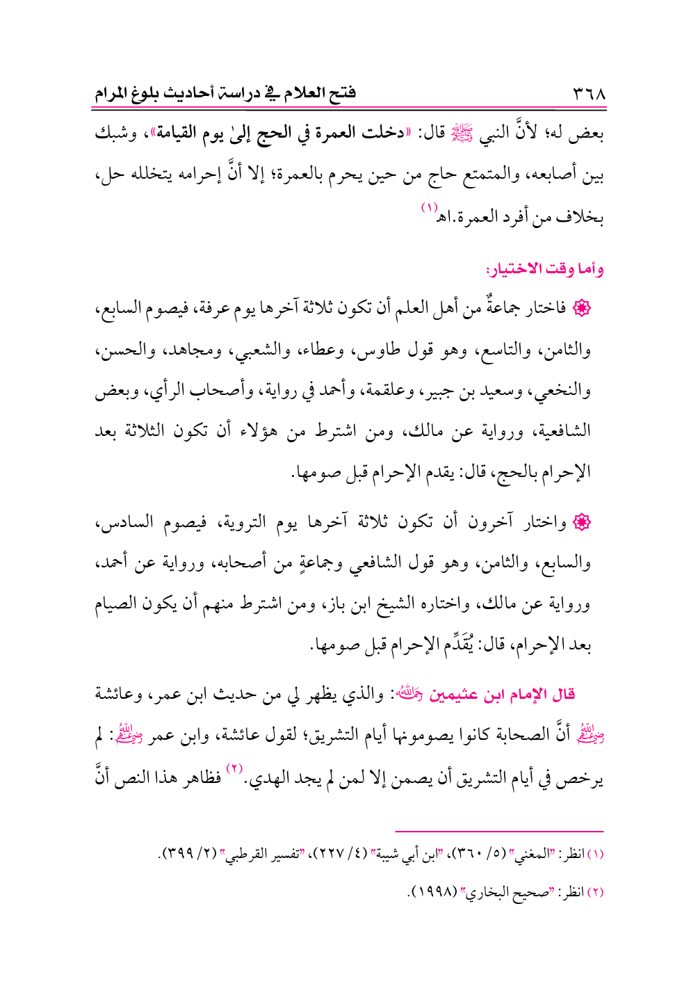 قال الإمام ابن عثيمين -رحمه الله-: والذي يظهر لي من حديث ابن عمر، وعائشة -رضي الله عنهم- أنَّ الصحابة كانوا يصومونها أيام التشريق؛ لقول عائشة، وابن عمر -رضي الله عنهم-: لم يرخص في أيام التشريق أن يصمن إلا لمن لم يجد الهدي. (¬٢) فظاهر هذا النص أنَّ