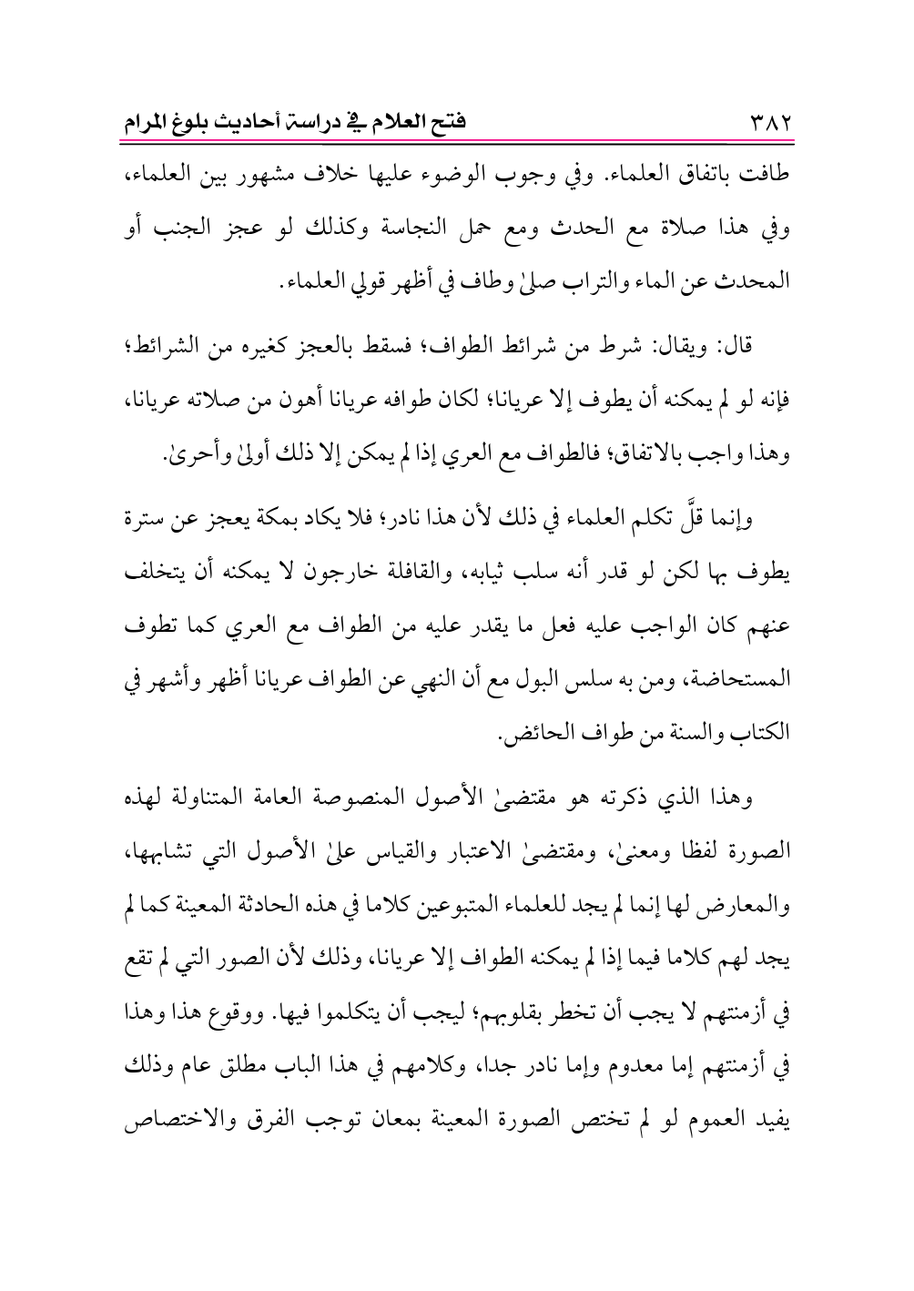 وهذا الذي ذكرته هو مقتضى الأصول المنصوصة العامة المتناولة لهذه الصورة لفظا ومعنى، ومقتضى الاعتبار والقياس على الأصول التي تشابهها، والمعارض لها إنما لم يجد للعلماء المتبوعين كلاما في هذه الحادثة المعينة كما لم يجد لهم كلاما فيما إذا لم يمكنه الطواف إلا عريانا، وذلك لأن الصور التي لم تقع في أزمنتهم لا يجب أن تخطر بقلوبهم؛ ليجب أن يتكلموا فيها. ووقوع هذا وهذا في أزمنتهم إما معدوم وإما نادر جدا، وكلامهم في هذا الباب مطلق عام وذلك يفيد العموم لو لم تختص الصورة المعينة بمعان توجب الفرق والاختصاص