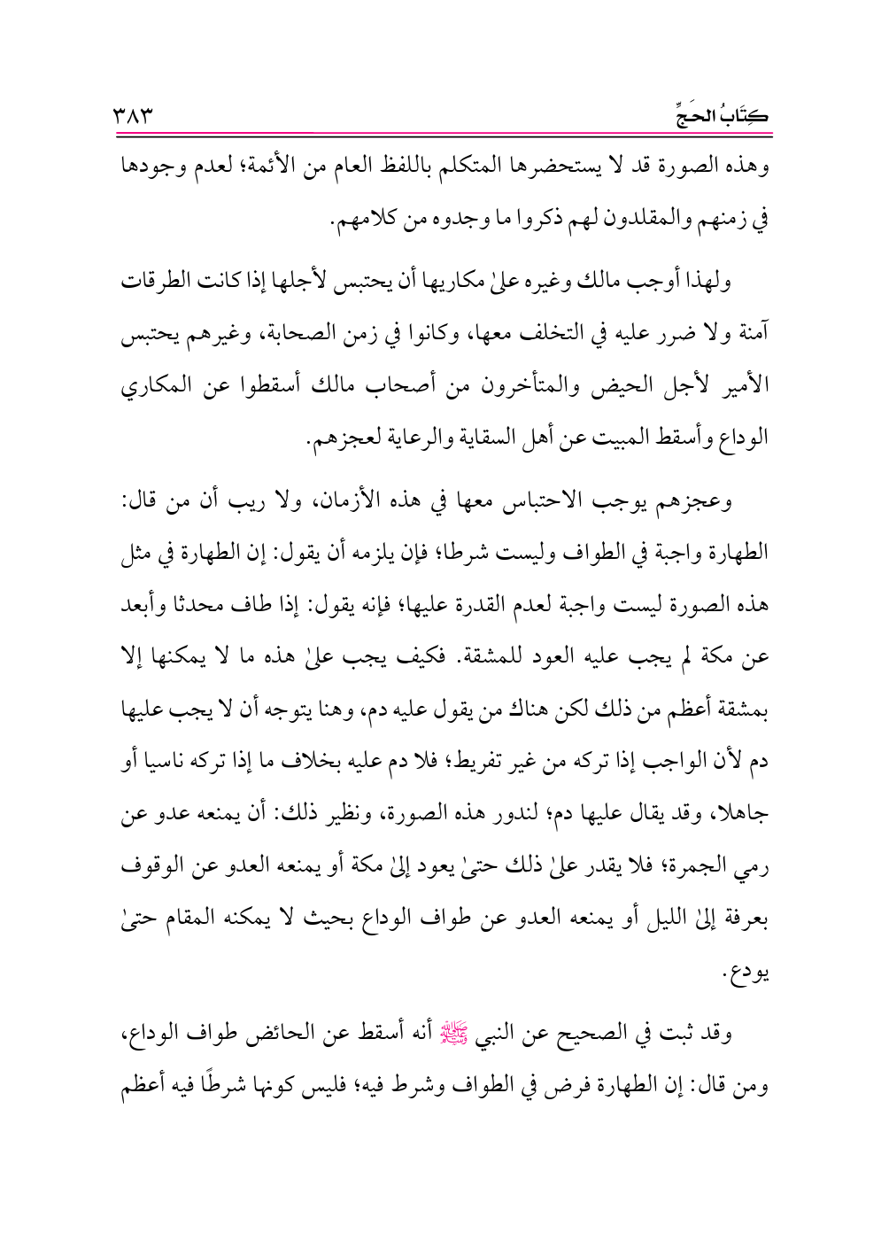 وعجزهم يوجب الاحتباس معها في هذه الأزمان، ولا ريب أن من قال: الطهارة واجبة في الطواف وليست شرطا؛ فإن يلزمه أن يقول: إن الطهارة في مثل هذه الصورة ليست واجبة لعدم القدرة عليها؛ فإنه يقول: إذا طاف محدثا وأبعد عن مكة لم يجب عليه العود للمشقة. فكيف يجب على هذه ما لا يمكنها إلا بمشقة أعظم من ذلك لكن هناك من يقول عليه دم، وهنا يتوجه أن لا يجب عليها دم لأن الواجب إذا تركه من غير تفريط؛ فلا دم عليه بخلاف ما إذا تركه ناسيا أو جاهلا، وقد يقال عليها دم؛ لندور هذه الصورة، ونظير ذلك: أن يمنعه عدو عن رمي الجمرة؛ فلا يقدر على ذلك حتى يعود إلى مكة أو يمنعه العدو عن الوقوف بعرفة إلى الليل أو يمنعه العدو عن طواف الوداع بحيث لا يمكنه المقام حتى يودع.