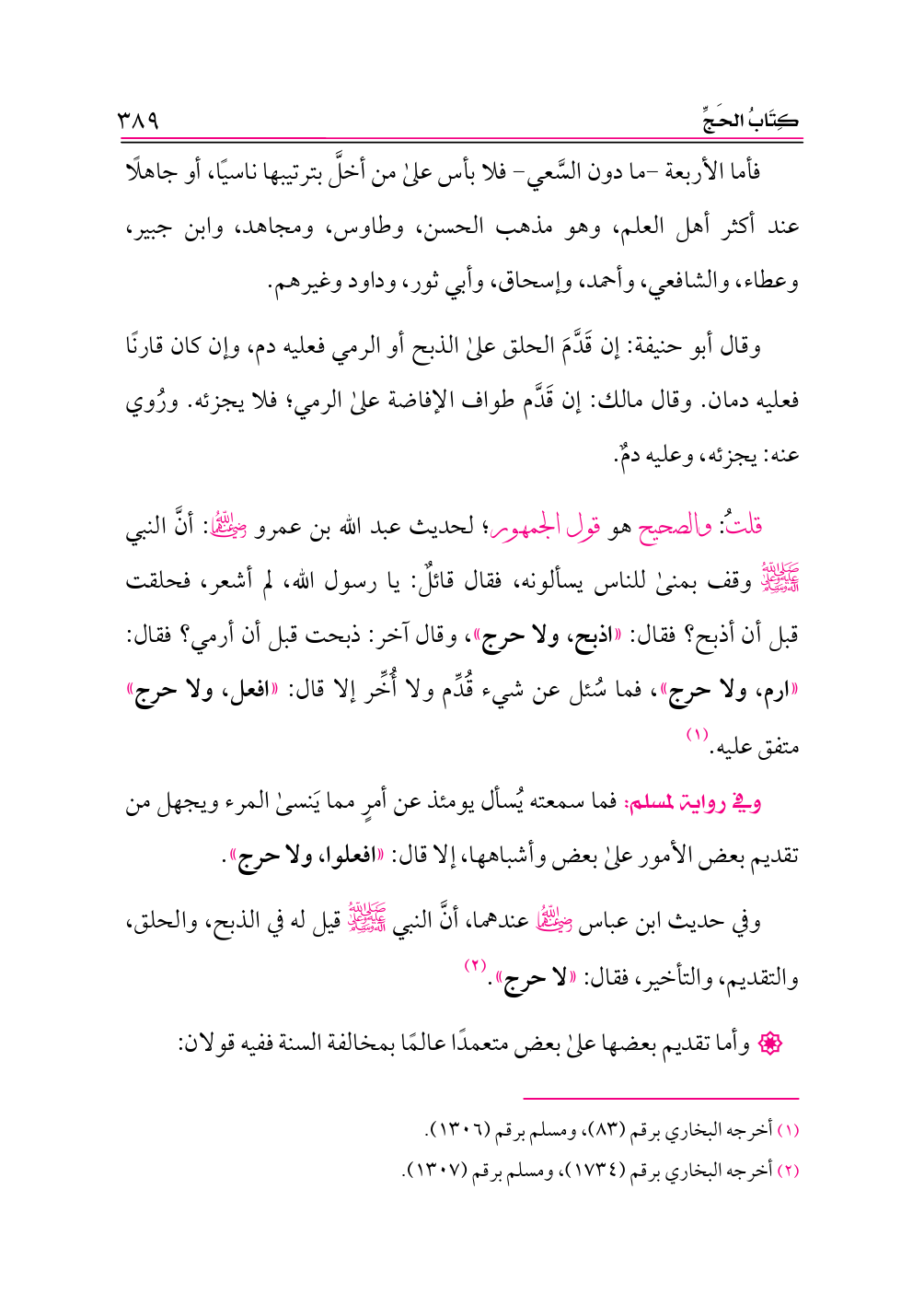 قلتُ: والصحيح هو قول الجمهور؛ لحديث عبد الله بن عمرو -رضي الله عنهما-: أنَّ النبي -صلى الله عليه وعلى آله وسلم- وقف بمنى للناس يسألونه، فقال قائلٌ: يا رسول الله، لم أشعر، فحلقت قبل أن أذبح؟ فقال: «اذبح، ولا حرج»، وقال آخر: ذبحت قبل أن أرمي؟ فقال: «ارم، ولا حرج»، فما سُئل عن شيء قُدِّم ولا أُخِّر إلا قال: «افعل، ولا حرج» متفق عليه. (¬١)