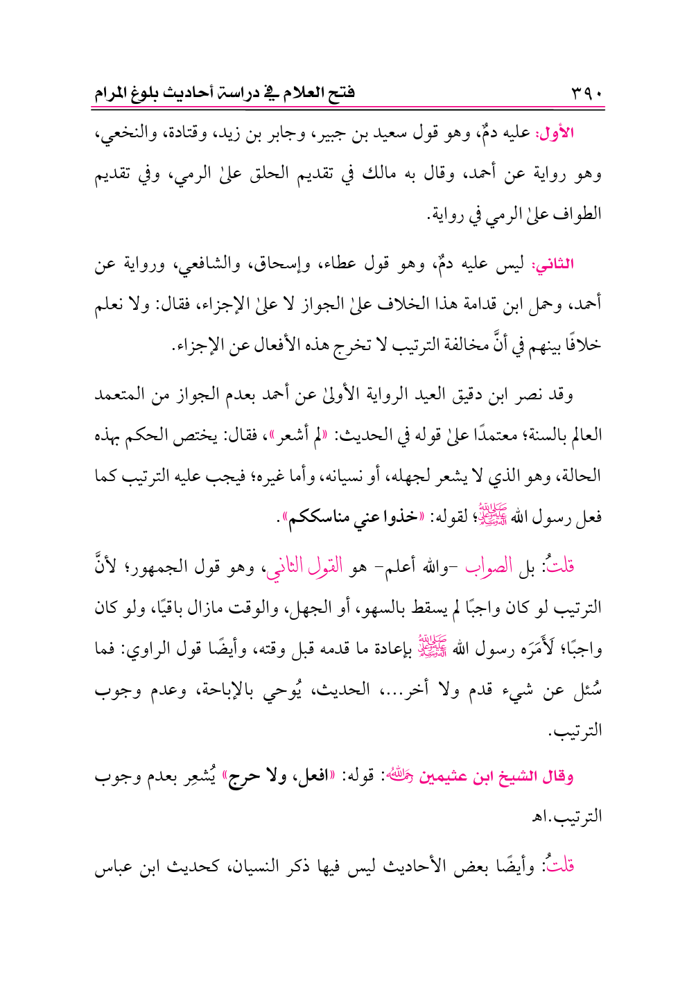قلتُ: بل الصواب -والله أعلم- هو القول الثاني، وهو قول الجمهور؛ لأنَّ الترتيب لو كان واجبًا لم يسقط بالسهو، أو الجهل، والوقت مازال باقيًا، ولو كان واجبًا؛ لَأَمَرَه رسول الله -صلى الله عليه وعلى آله وسلم- بإعادة ما قدمه قبل وقته، وأيضًا قول الراوي: فما سُئل عن شيء قدم ولا أخر ... ، الحديث، يُوحي بالإباحة، وعدم وجوب الترتيب.