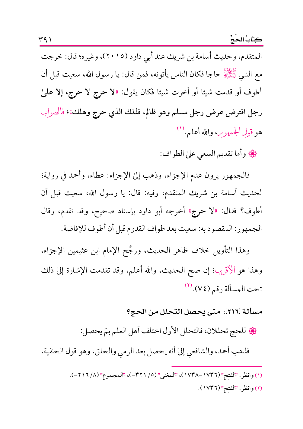 المتقدم، وحديث أسامة بن شريك عند أبي داود (٢٠١٥)، وغيره؛ قال: خرجت مع النبي -صلى الله عليه وعلى آله وسلم- حاجا فكان الناس يأتونه، فمن قال: يا رسول الله، سعيت قبل أن أطوف أو قدمت شيئا أو أخرت شيئا فكان يقول: «لا حرج لا حرج، إلا على رجل اقترض عرض رجل مسلم وهو ظالم، فذلك الذي حرج وهلك»؛ فالصواب هو قول الجمهور، والله أعلم. (¬١)