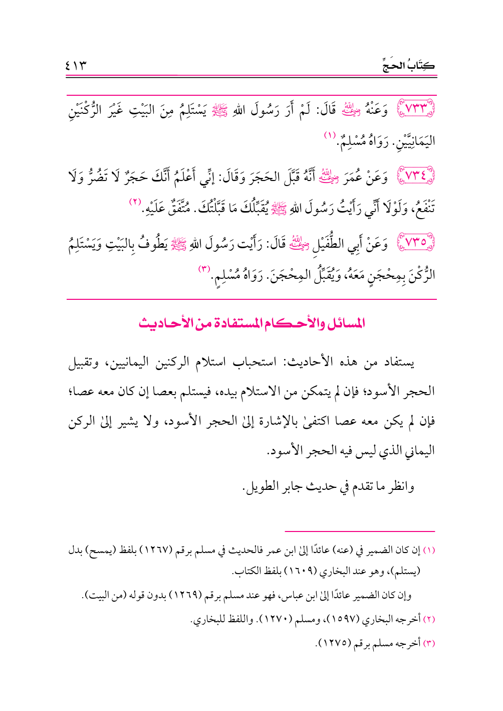(¬١) إن كان الضمير في (عنه) عائدًا إلى ابن عمر فالحديث في مسلم برقم (١٢٦٧) بلفظ (يمسح) بدل (يستلم)، وهو عند البخاري (١٦٠٩) بلفظ الكتاب.