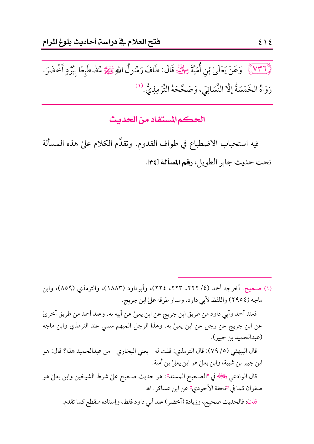 ٧٣٦ - وَعَنْ يَعْلَى بْنِ أُمَيَّةَ -رضي الله عنه- قَالَ: طَافَ رَسُولُ اللهِ - صلى الله عليه وسلم - مُضْطَبِعًا بِبُرْدٍ أَخْضَرَ. رَوَاهُ الخَمْسَةُ إلَّا النَّسَائِيّ، وَصَحَّحَهُ التِّرْمِذِيُّ. (¬١)