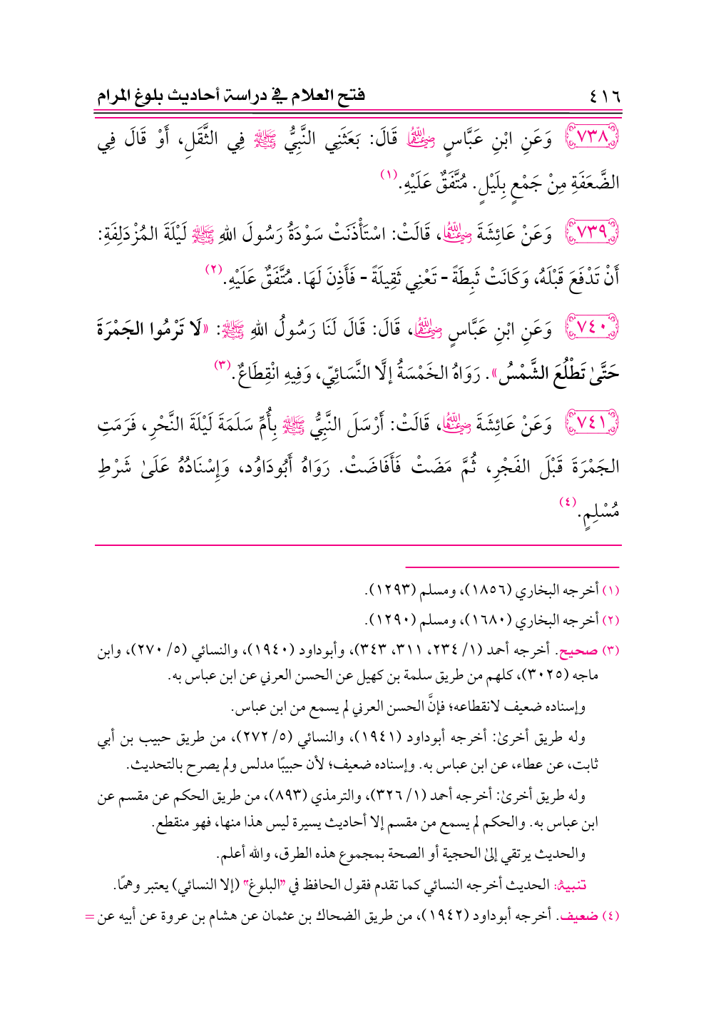 ٧٤٠ - وَعَنِ ابْنِ عَبَّاسٍ -رضي الله عنهما-، قَالَ: قَالَ لَنَا رَسُولُ اللهِ - صلى الله عليه وسلم -: «لَا تَرْمُوا الجَمْرَةَ حَتَّى تَطْلُعَ الشَّمْسُ». رَوَاهُ الخَمْسَةُ إلَّا النَّسَائِيّ، وَفِيهِ انْقِطَاعٌ. (¬٣)