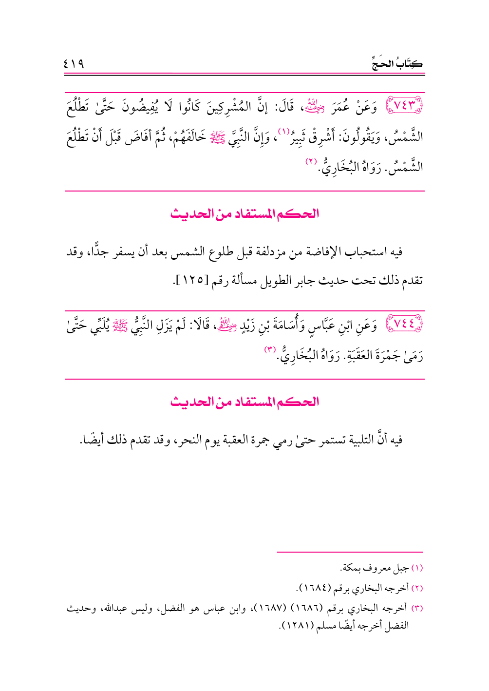 ٧٤٤ - وَعَنِ ابْنِ عَبَّاسٍ وَأُسَامَةَ بْنِ زَيْدٍ -رضي الله عنهم-، قَالَا: لَمْ يَزَلِ النَّبِيُّ - صلى الله عليه وسلم - يُلَبِّي حَتَّى رَمَى جَمْرَةَ العَقَبَةِ. رَوَاهُ البُخَارِيُّ. (¬٣)