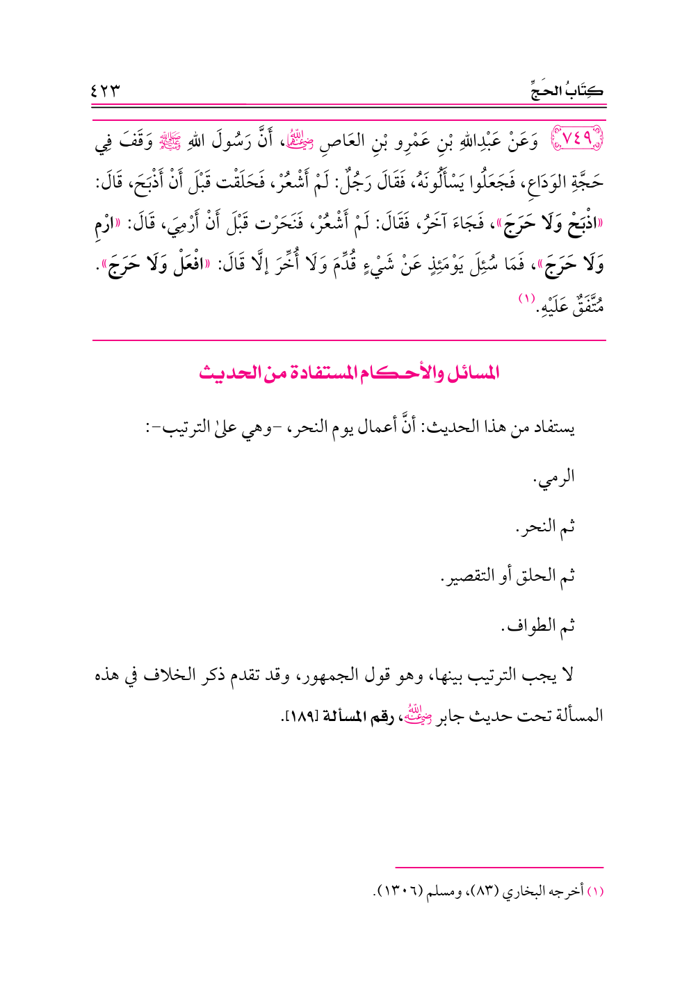 يستفاد من هذا الحديث: أنَّ أعمال يوم النحر، -وهي على الترتيب-: