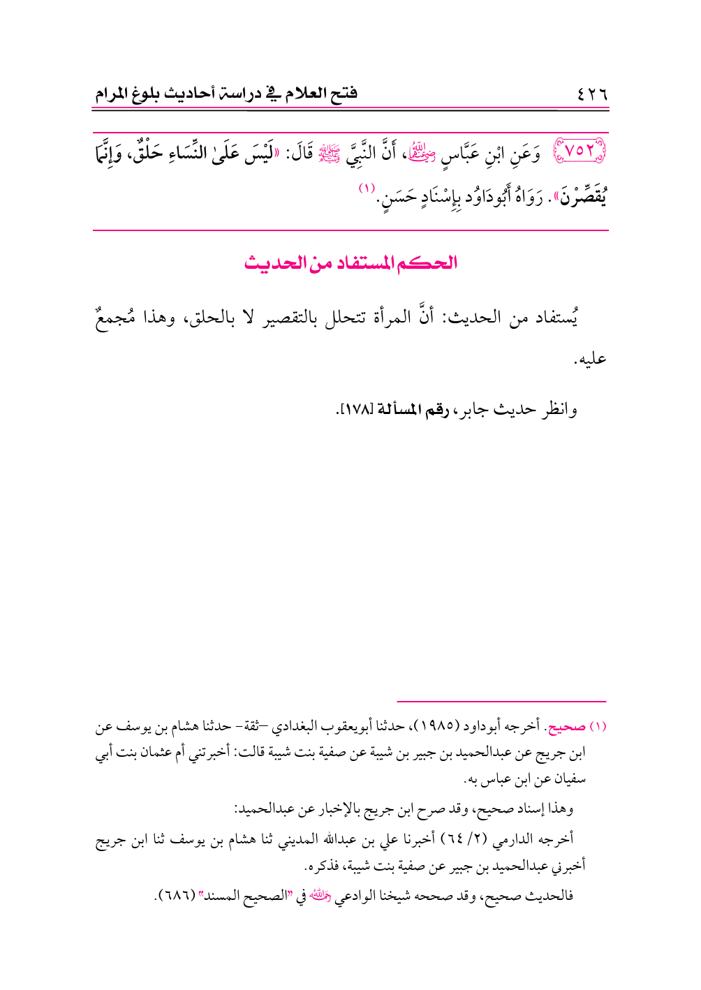 ٧٥٢ - وَعَنِ ابْنِ عَبَّاسٍ -رضي الله عنهما-، أَنَّ النَّبِيَّ - صلى الله عليه وسلم - قَالَ: «لَيْسَ عَلَى النِّسَاءِ حَلْقٌ، وَإِنَّمَا يُقَصِّرْنَ». رَوَاهُ أَبُودَاوُد بِإِسْنَادٍ حَسَنٍ. (¬١)