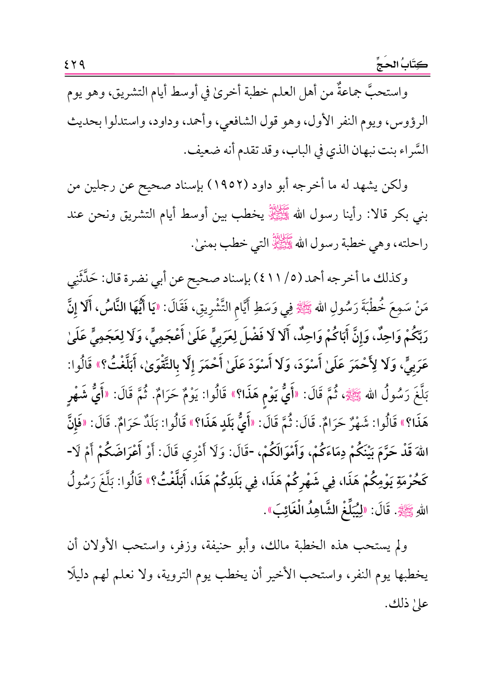 وكذلك ما أخرجه أحمد (٥/ ٤١١) بإسناد صحيح عن أبي نضرة قال: حَدَّثَنِي مَنْ سَمِعَ خُطْبَةَ رَسُولِ الله - صلى الله عليه وسلم - فِي وَسَطِ أَيَّامِ التَّشْرِيقِ، فَقَالَ: «يَا أَيُّهَا النَّاسُ، أَلَا إِنَّ رَبَّكُمْ وَاحِدٌ، وَإِنَّ أَبَاكُمْ وَاحِدٌ، أَلَا لَا فَضْلَ لِعَرَبِيٍّ عَلَى أَعْجَمِيٍّ، وَلَا لِعَجَمِيٍّ عَلَى عَرَبِيٍّ، وَلَا لِأَحْمَرَ عَلَى أَسْوَدَ، وَلَا أَسْوَدَ عَلَى أَحْمَرَ إِلَّا بِالتَّقْوَى، أَبَلَّغْتُ؟» قَالُوا: بَلَّغَ رَسُولُ الله - صلى الله عليه وسلم -، ثُمَّ قَالَ: «أَيُّ يَوْمٍ هَذَا؟» قَالُوا: يَوْمٌ حَرَامٌ. ثُمَّ قَالَ: «أَيُّ شَهْرٍ هَذَا؟» قَالُوا: شَهْرٌ حَرَامٌ. قَالَ: ثُمَّ قَالَ: «أَيُّ بَلَدٍ هَذَا؟» قَالُوا: بَلَدٌ حَرَامٌ. قَالَ: «فَإِنَّ اللهَ قَدْ حَرَّمَ بَيْنَكُمْ دِمَاءَكُمْ، وَأَمْوَالَكُمْ، قَالَ: وَلَا أَدْرِي قَالَ: أَوْ أَعْرَاضَكُمْ أَمْ لَا كَحُرْمَةِ يَوْمِكُمْ هَذَا، فِي شَهْرِكُمْ هَذَا، فِي بَلَدِكُمْ هَذَا، أَبَلَّغْتُ؟» قَالُوا: بَلَّغَ رَسُولُ اللهِ - صلى الله عليه وسلم -. قَالَ: «لِيُبَلِّغْ الشَّاهِدُ الْغَائِبَ».