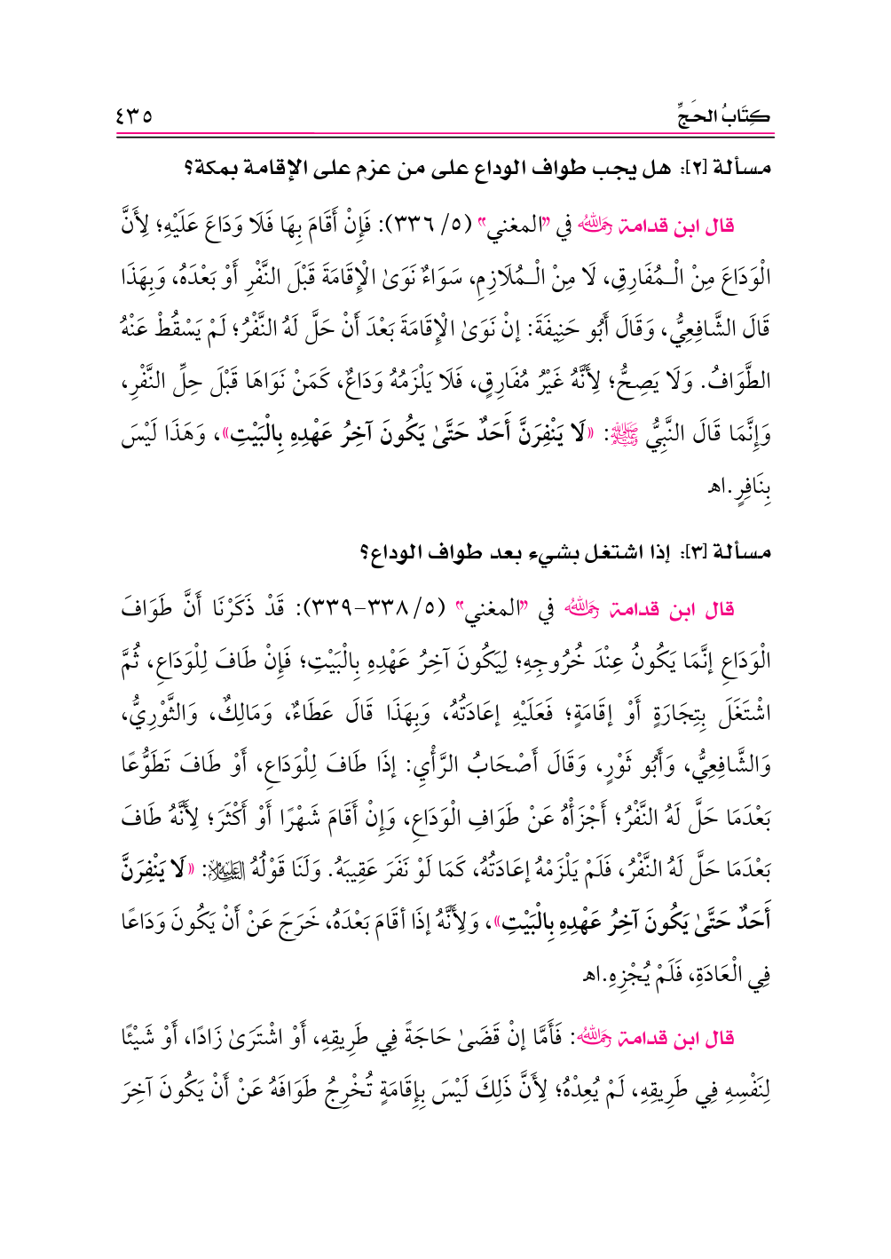 قال ابن قدامة -رحمه الله- في «المغني» (٥/ ٣٣٦): فَإِنْ أَقَامَ بِهَا فَلَا وَدَاعَ عَلَيْهِ؛ لِأَنَّ الْوَدَاعَ مِنْ الْمُفَارِقِ، لَا مِنْ الْمُلَازِمِ، سَوَاءٌ نَوَى الْإِقَامَةَ قَبْلَ النَّفْرِ أَوْ بَعْدَهُ، وَبِهَذَا قَالَ الشَّافِعِيُّ، وَقَالَ أَبُو حَنِيفَةَ: إنْ نَوَى الْإِقَامَةَ بَعْدَ أَنْ حَلَّ لَهُ النَّفْرُ؛ لَمْ يَسْقُطْ عَنْهُ الطَّوَافُ. وَلَا يَصِحُّ؛ لِأَنَّهُ غَيْرُ مُفَارِقٍ، فَلَا يَلْزَمُهُ وَدَاعٌ، كَمَنْ نَوَاهَا قَبْلَ حِلِّ النَّفْرِ، وَإِنَّمَا قَالَ النَّبِيُّ - صلى الله عليه وسلم -: «لَا يَنْفِرَنَّ أَحَدٌ حَتَّى يَكُونَ آخِرُ عَهْدِهِ بِالْبَيْتِ»، وَهَذَا لَيْسَ بِنَافِرٍ. اهـ