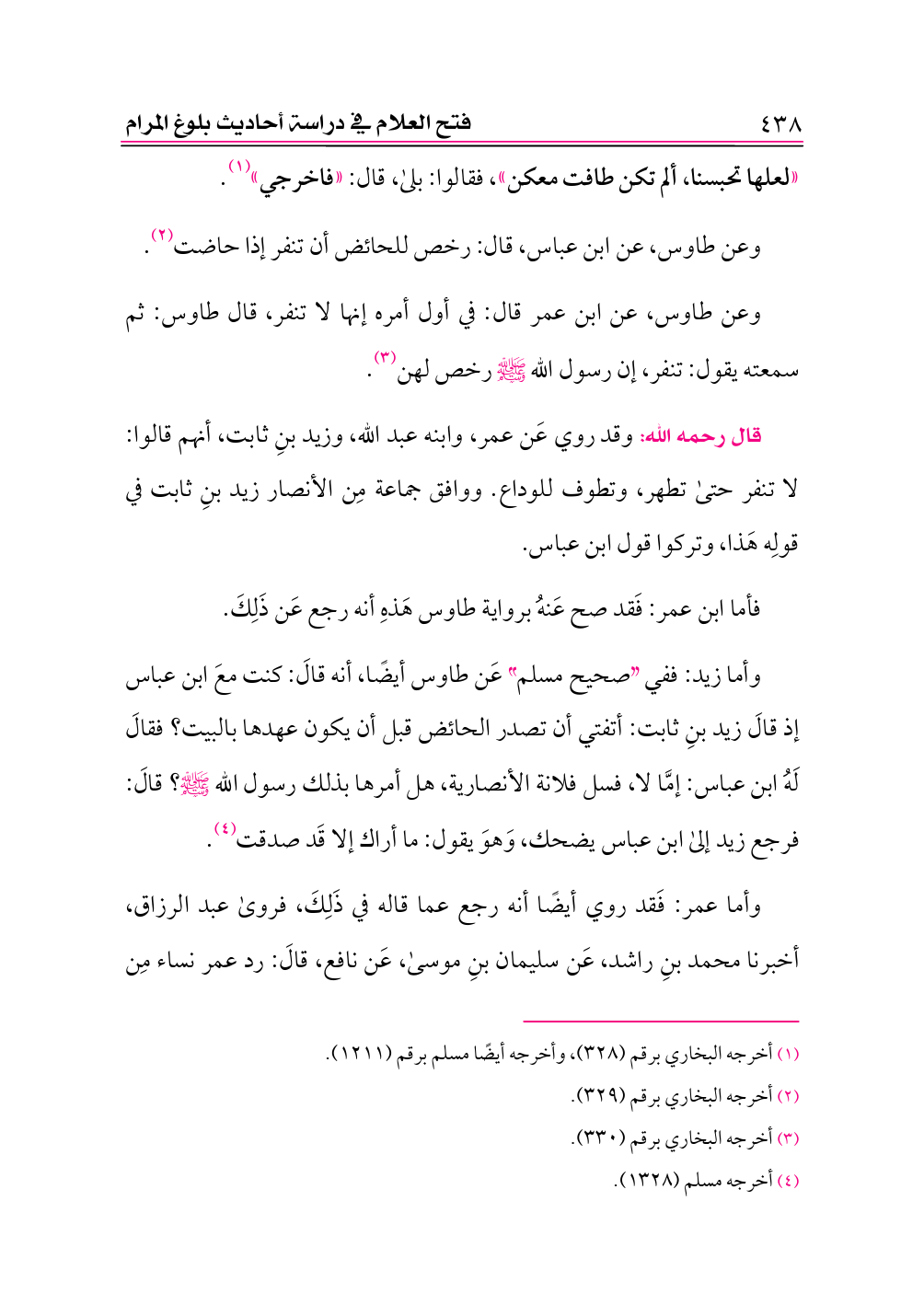 وعن طاوس، عن ابن عمر قال: في أول أمره إنها لا تنفر، قال طاوس: ثم سمعته يقول: تنفر، إن رسول الله - صلى الله عليه وسلم - رخص لهن (¬٣).