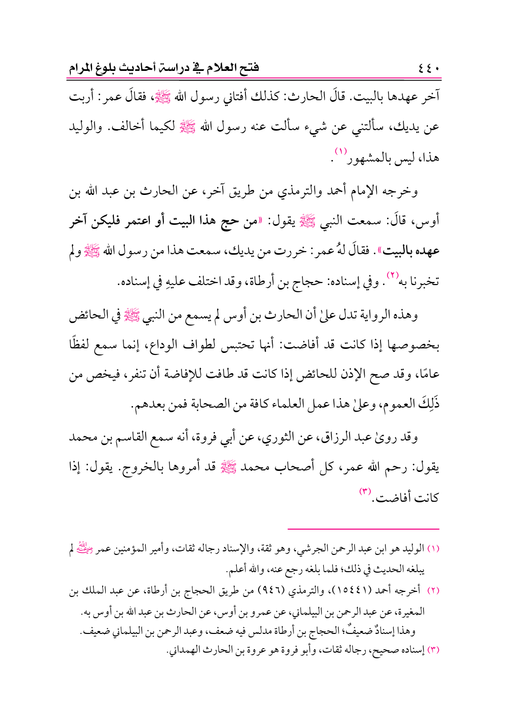 وهذه الرواية تدل على أن الحارث بن أوس لم يسمع من النبي - صلى الله عليه وسلم - في الحائض بخصوصها إذا كانت قد أفاضت: أنها تحتبس لطواف الوداع، إنما سمع لفظًا عامًا، وقد صح الإذن للحائض إذا كانت قد طافت للإفاضة أن تنفر، فيخص من ذَلِكَ العموم، وعلى هذا عمل العلماء كافة من الصحابة فمن بعدهم.