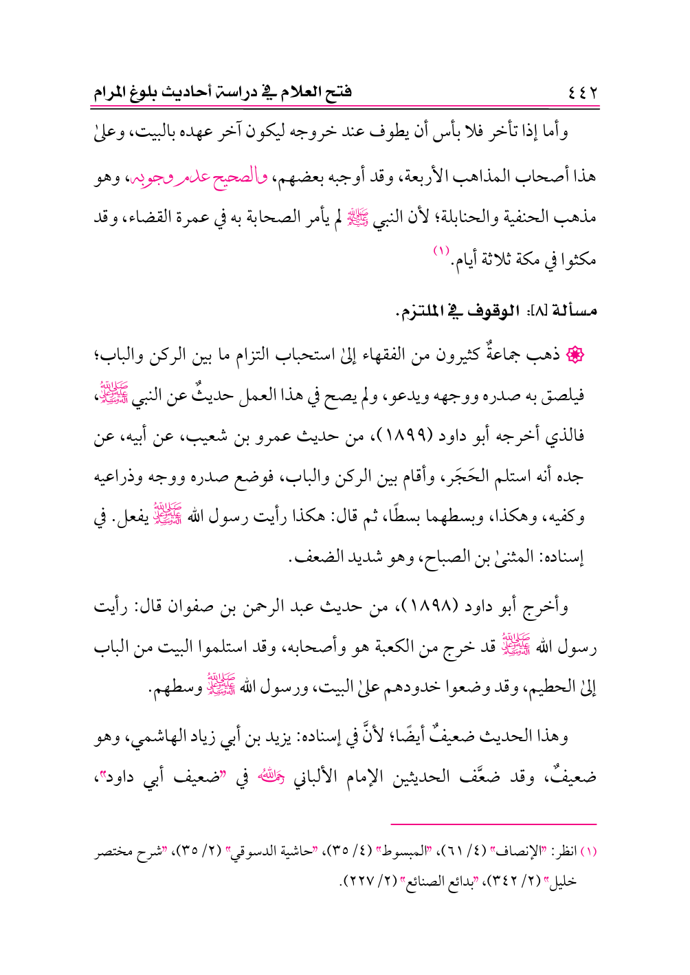 • ذهب جماعةٌ كثيرون من الفقهاء إلى استحباب التزام ما بين الركن والباب؛ فيلصق به صدره ووجهه ويدعو، ولم يصح في هذا العمل حديثٌ عن النبي -صلى الله عليه وعلى آله وسلم-، فالذي أخرجه أبو داود (١٨٩٩)، من حديث عمرو بن شعيب، عن أبيه، عن جده أنه استلم الحَجَر، وأقام بين الركن والباب، فوضع صدره ووجه وذراعيه وكفيه، وهكذا، وبسطهما بسطًا، ثم قال: هكذا رأيت رسول الله -صلى الله عليه وعلى آله وسلم- يفعل. في إسناده: المثنى بن الصباح، وهو شديد الضعف.
