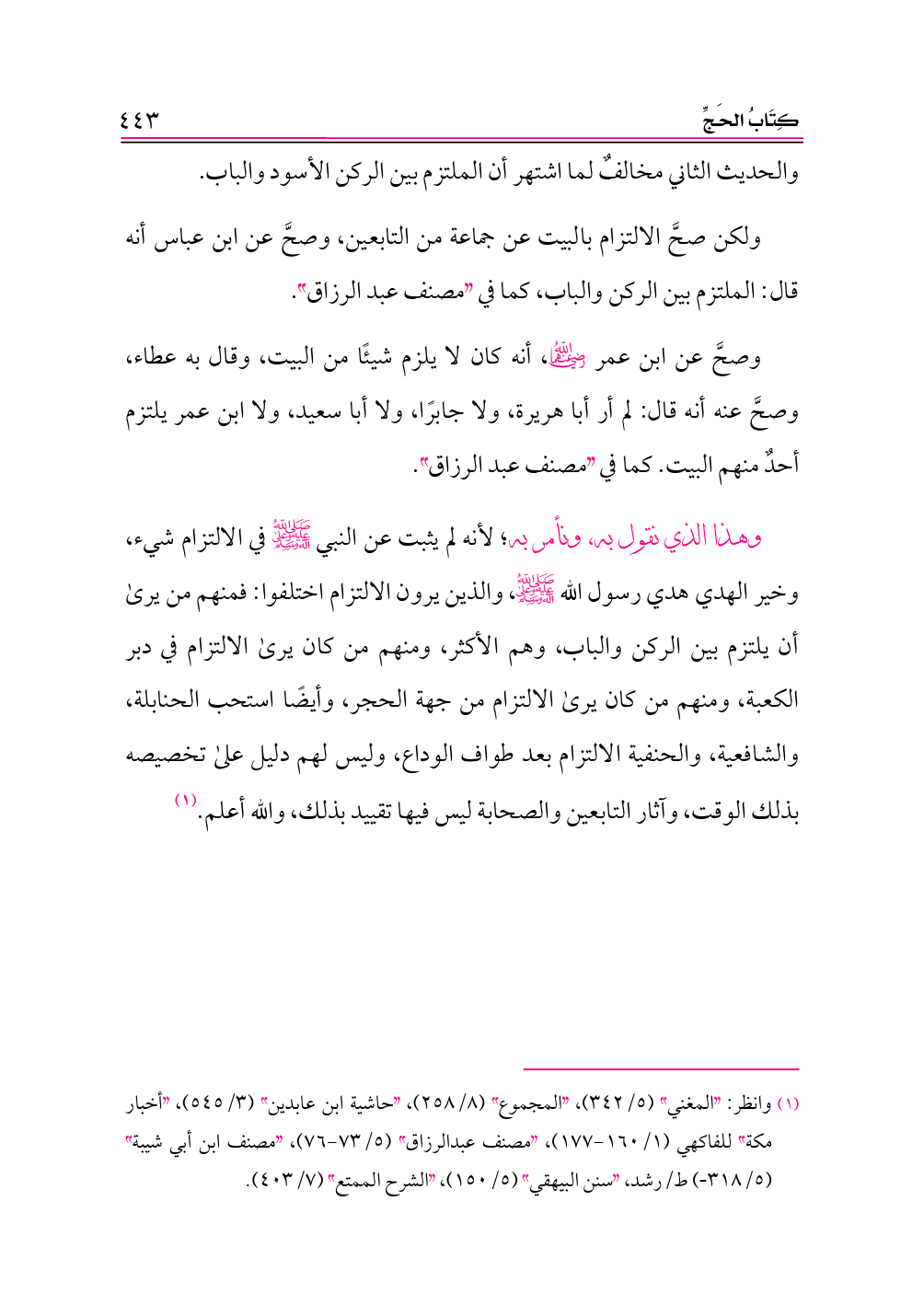 ولكن صحَّ الالتزام بالبيت عن جماعة من التابعين، وصحَّ عن ابن عباس أنه قال: الملتزم بين الركن والباب، كما في «مصنف عبد الرزاق».