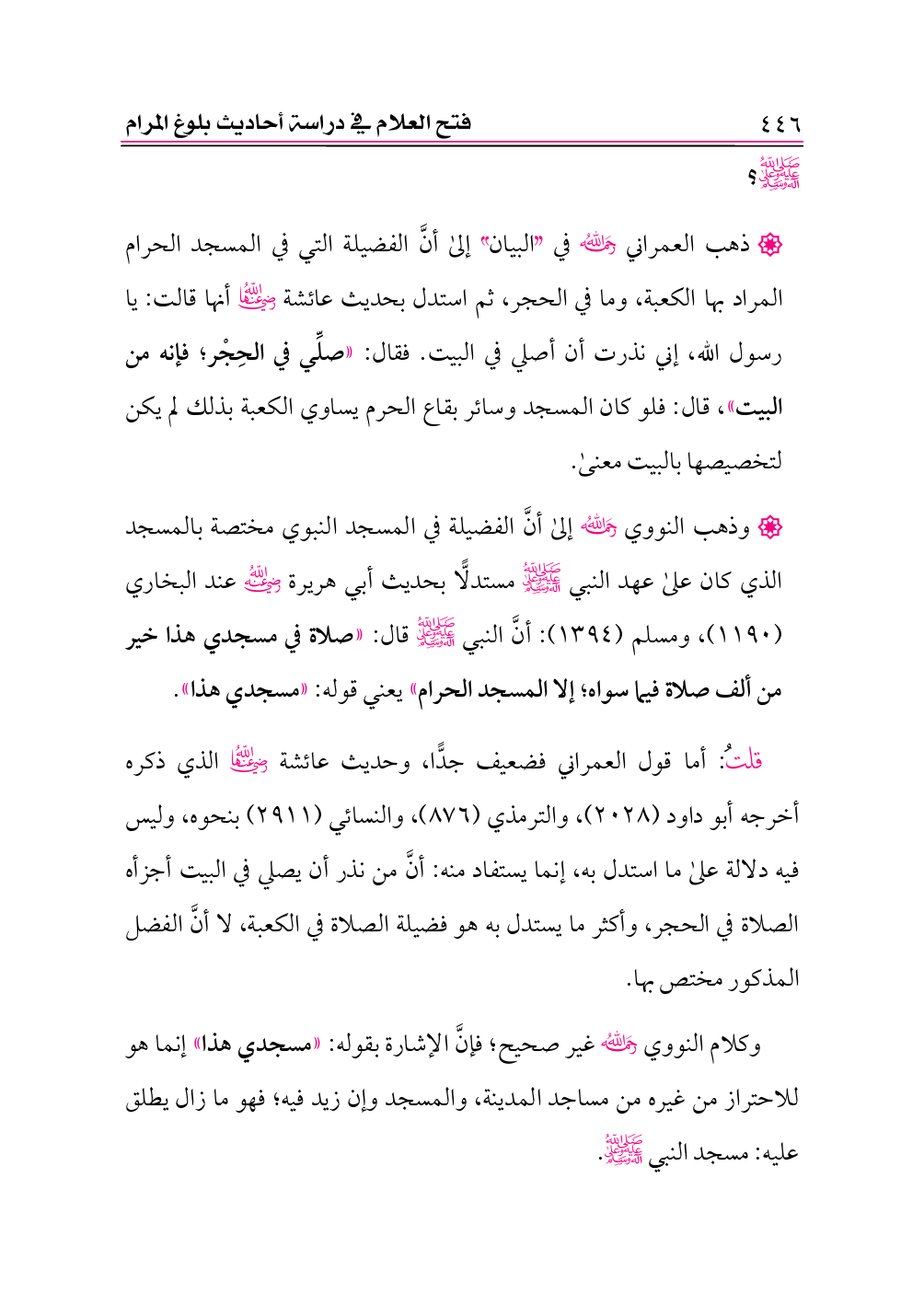• وذهب النووي -رحمه الله- إلى أنَّ الفضيلة في المسجد النبوي مختصة بالمسجد الذي كان على عهد النبي -صلى الله عليه وعلى آله وسلم- مستدلًّا بحديث أبي هريرة -رضي الله عنه- عند البخاري (١١٩٠)، ومسلم (١٣٩٤): أنَّ النبي -صلى الله عليه وعلى آله وسلم- قال: «صلاة في مسجدي هذا خير من ألف صلاة فيما سواه؛ إلا المسجد الحرام» يعني قوله: «مسجدي هذا».