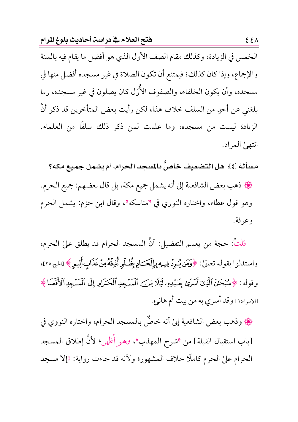 قلتُ: حجة من يعمم التفضيل: أنَّ المسجد الحرام قد يطلق على الحرم، واستدلوا بقوله تعالى: {وَمَنْ يُرِدْ فِيهِ بِإِلْحَادٍ بِظُلْمٍ نُذِقْهُ مِنْ عَذَابٍ أَلِيمٍ} [الحج:٢٥]، وقوله: {سُبْحَانَ الَّذِي أَسْرَى بِعَبْدِهِ لَيْلًا مِنَ الْمَسْجِدِ الْحَرَامِ إِلَى الْمَسْجِدِ الْأَقْصَى} [الإسراء:١] وقد أسري به من بيت أم هانئ.