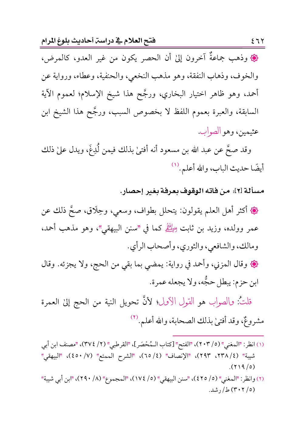 (¬١) انظر: «المغني» (٥/ ٢٠٣)، «الفتح» [كتاب المُحْصَر]، «القرطبي» (٢/ ٣٧٤)، «مصنف ابن أبي شيبة» (٤/ ٢٣٨، ٢٩٣)، «الإنصاف» (٤/ ٦٥)، «الشرح الممتع» (٧/ ٤٥٠)، «البيهقي» (٥/ ٢١٩).