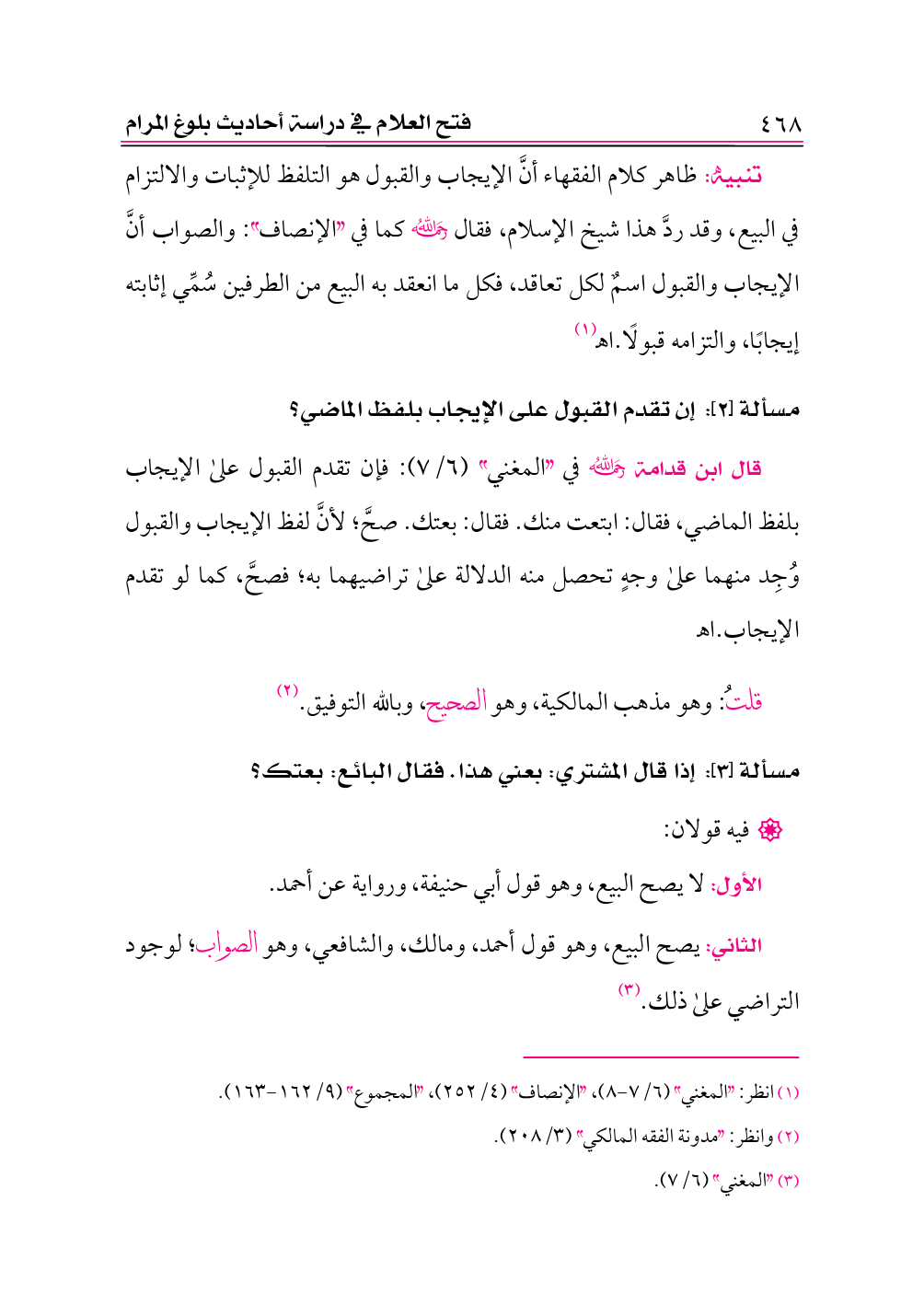 تنبيه: ظاهر كلام الفقهاء أنَّ الإيجاب والقبول هو التلفظ للإثبات والالتزام في البيع، وقد ردَّ هذا شيخ الإسلام، فقال -رحمه الله- كما في «الإنصاف»: والصواب أنَّ الإيجاب والقبول اسمٌ لكل تعاقد، فكل ما انعقد به البيع من الطرفين سُمِّي إثابته إيجابًا، والتزامه قبولًا. اهـ (¬١)