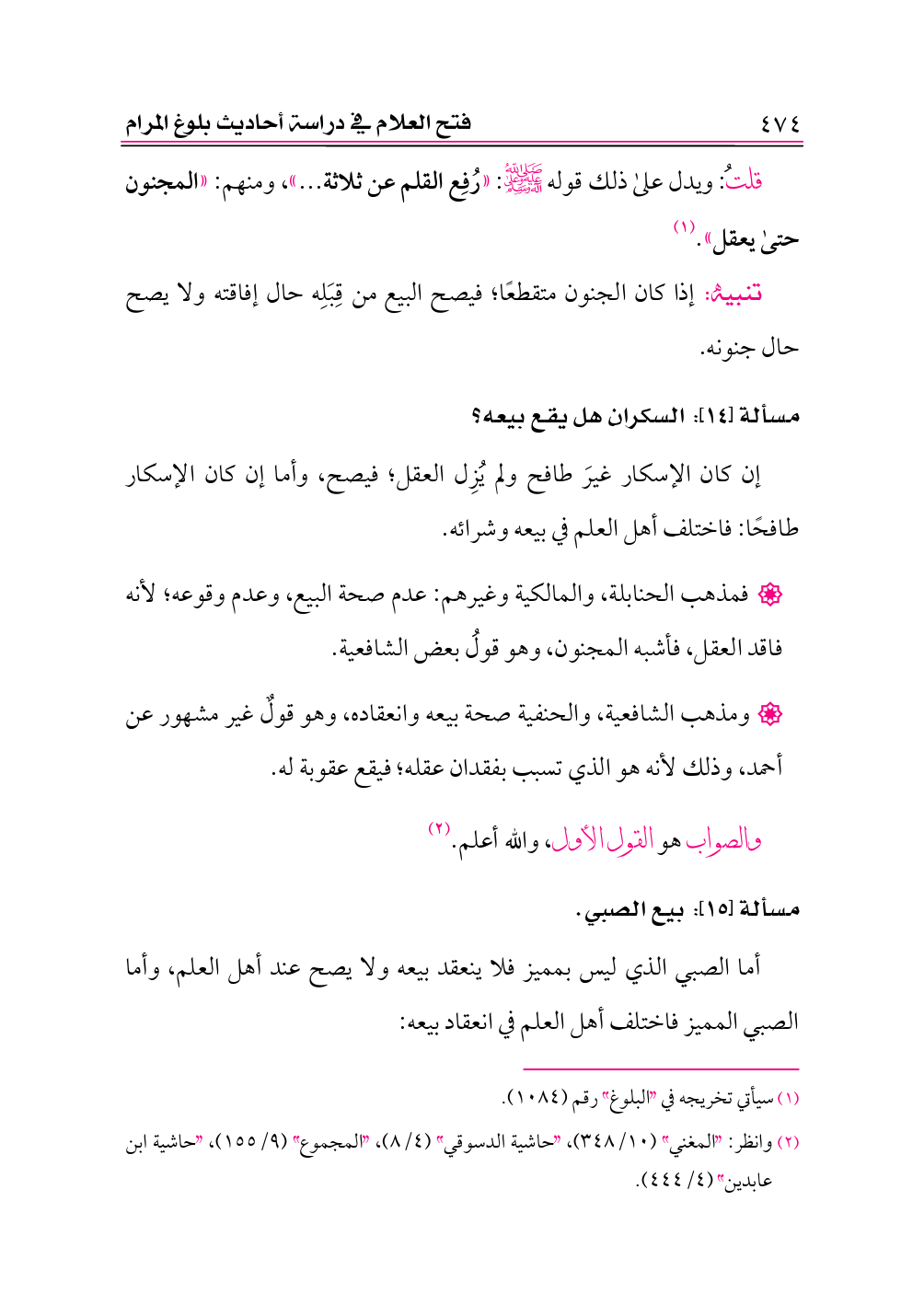 مسألة [١٤]: السكران هل يقع بيعه؟