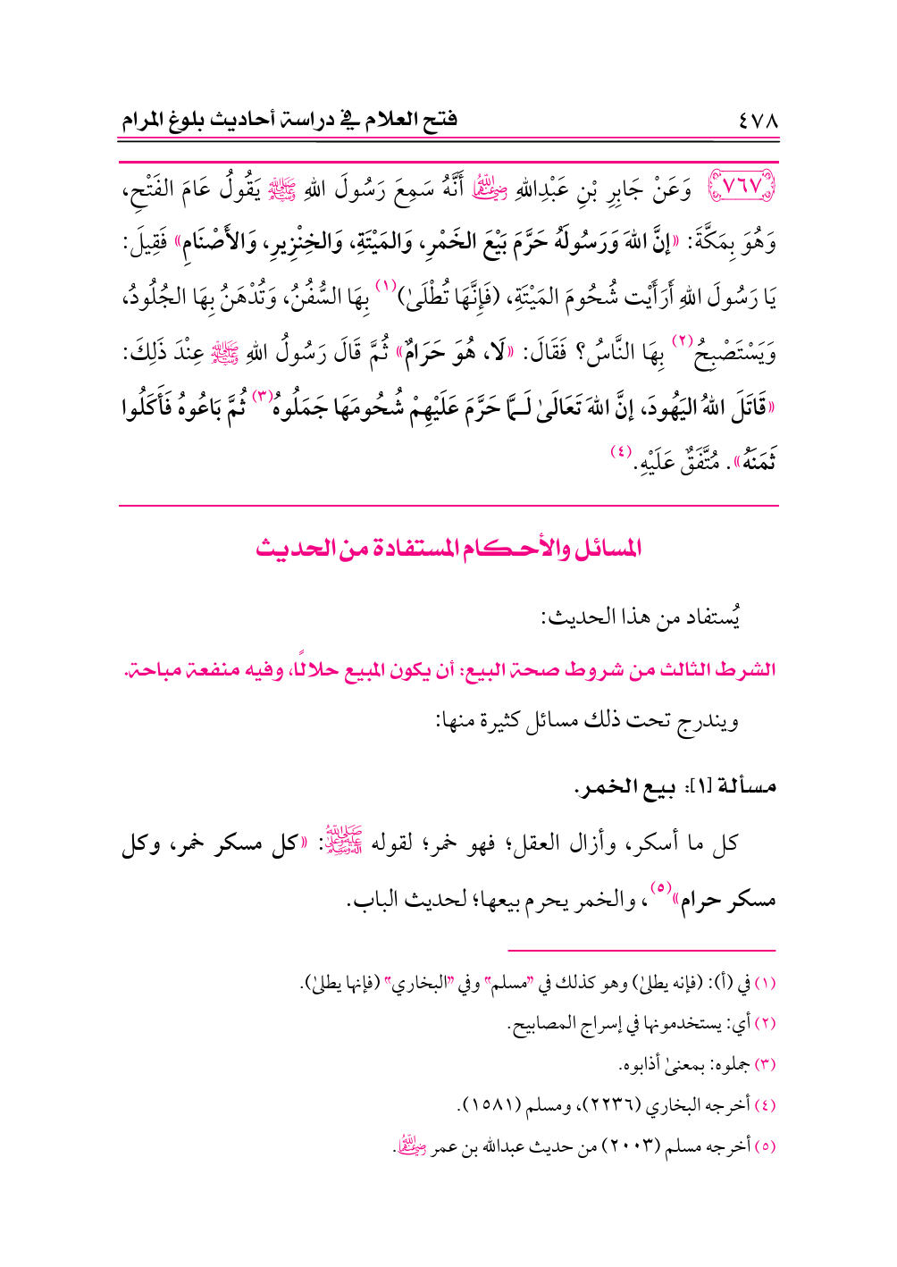 ٧٦٧ - وَعَنْ جَابِرِ بْنِ عَبْدِاللهِ -رضي الله عنهما- أَنَّهُ سَمِعَ رَسُولَ اللهِ - صلى الله عليه وسلم - يَقُولُ عَامَ الفَتْحِ، وَهُوَ بِمَكَّةَ: «إنَّ اللهَ وَرَسُولَهُ حَرَّمَ بَيْعَ الخَمْرِ، وَالمَيْتَةِ، وَالخِنْزِيرِ، وَالأَصْنَامِ» فَقِيلَ: يَا رَسُولَ اللهِ أَرَأَيْت شُحُومَ المَيْتَةِ، (فَإِنَّهَا تُطْلَى) (¬١) بِهَا السُّفُنُ، وَتُدْهَنُ بِهَا الجُلُودُ، وَيَسْتَصْبِحُ (¬٢) بِهَا النَّاسُ؟ فَقَالَ: «لَا، هُوَ حَرَامٌ» ثُمَّ قَالَ رَسُولُ اللهِ - صلى الله عليه وسلم - عِنْدَ ذَلِكَ: «قَاتَلَ اللهُ اليَهُودَ، إنَّ اللهَ تَعَالَى لَمَّا حَرَّمَ عَلَيْهِمْ شُحُومَهَا جَمَلُوهُ (¬٣) ثُمَّ بَاعُوهُ فَأَكَلُوا ثَمَنَهُ». مُتَّفَقٌ عَلَيْهِ. (¬٤)
