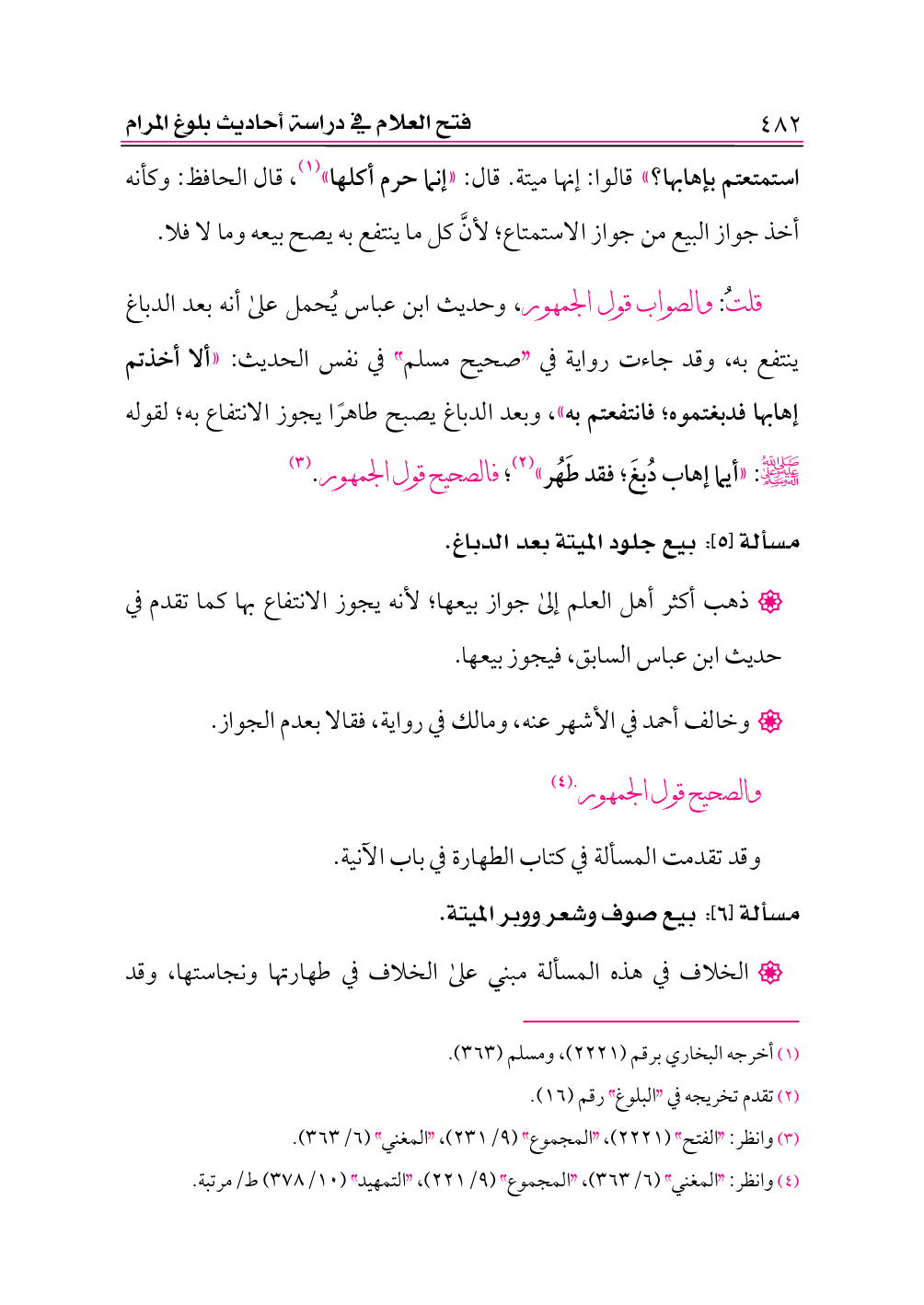 قلتُ: والصواب قول الجمهور، وحديث ابن عباس يُحمل على أنه بعد الدباغ ينتفع به، وقد جاءت رواية في «صحيح مسلم» في نفس الحديث: «ألا أخذتم إهابها فدبغتموه؛ فانتفعتم به»، وبعد الدباغ يصبح طاهرًا يجوز الانتفاع به؛ لقوله -صلى الله عليه وعلى آله وسلم-: «أيما إهاب دُبِغَ؛ فقد طَهُر» (¬٢)؛ فالصحيح قول الجمهور. (¬٣)